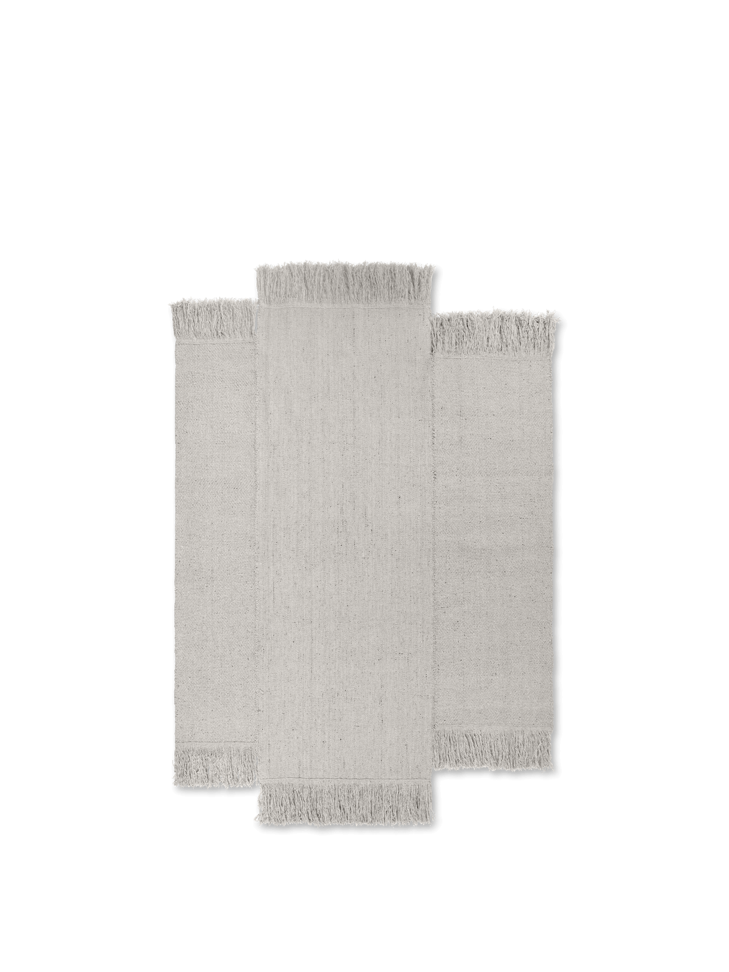With its unique and distinctive shape, the Alter Rug makes a captivating statement. Handwoven with natural, undyed wool, long panels are artfully arranged in an askew manner and meticulously stitched together, creating an elegant and visually striking piece. Long, untamed tassels grace each side of the rug, adding a touch of vibrancy and movement. Use the Alter Rug to cultivate a warm and serene ambiance in your space. Material: 100% wool. Product note: Length of fringes is 25 cm and included in measurements Registered Design - Care instructions: Vacuum only. In the beginning, the rug must be vacuumed frequently to remove natural rug shedding. Do not rub wet stains but absorb with paper towels and clean with a damp cloth. Professional carpet cleaning if needed