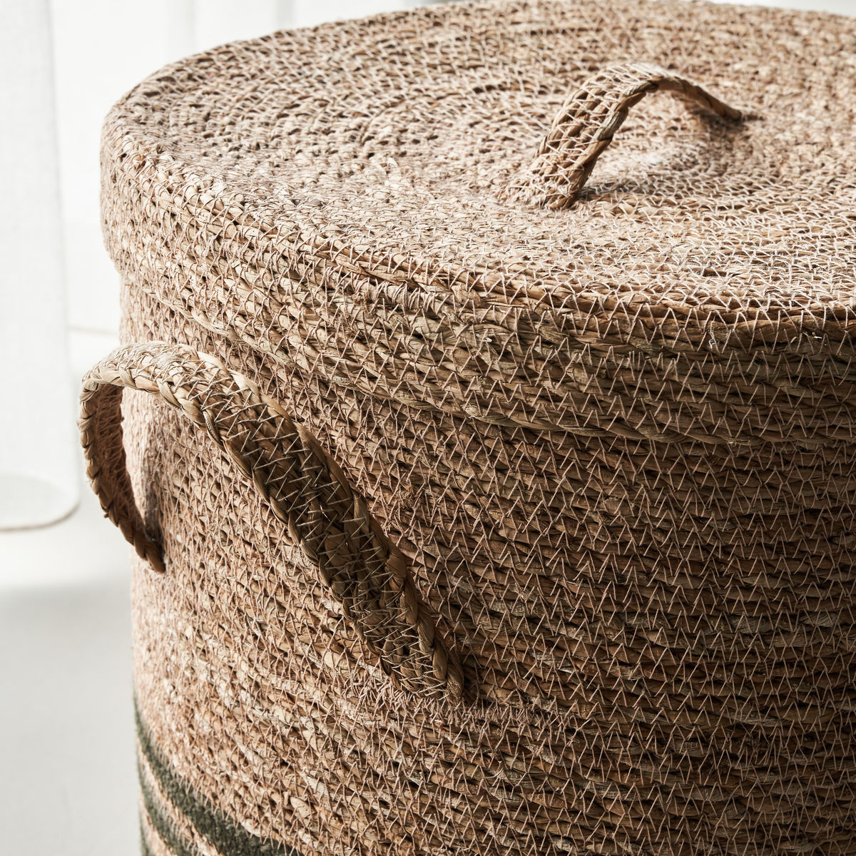 Keep your laundry sorted and out of sight with this set of 2 baskets with lid from House Doctor. Your room maintains a calm, decluttered look while the dark green stripes at the bottom complete the casual look of these baskets called Laundry. The baskets double as storage baskets as well. Place them in a corner of your living room to store throws or use them in your bedroom for extra storage space whenever needed. Material: Jute, Seagrass Care instructions: Clean with a dry cloth