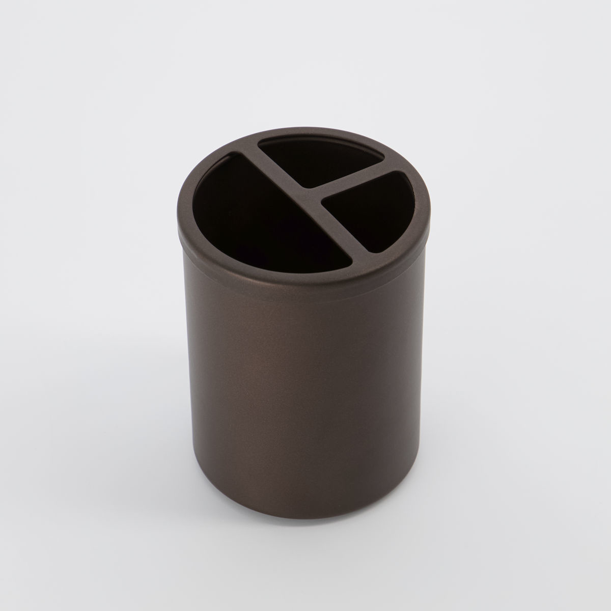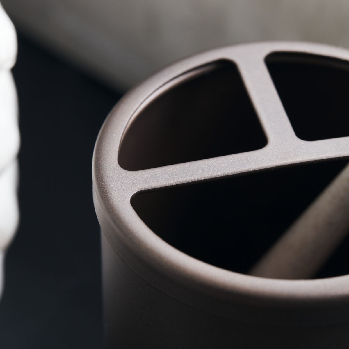 Use this tumbler in aluminium to give your bathroom a quick update without breaking the bank. Bush is designed by House Doctor and comes in a matt brown colour that adds a timeless yet modern twist to your bathroom décor. Use it as a toothbrush holder and place your toothbrushes in the two small compartment while the larger one holds your tooth paste. To give it a wash, simply remove the lid. Pair it with the soap dispenser in the same design for a cohesive look by your sink. Material: Aluminium Care instructions: Clean with a moist cloth