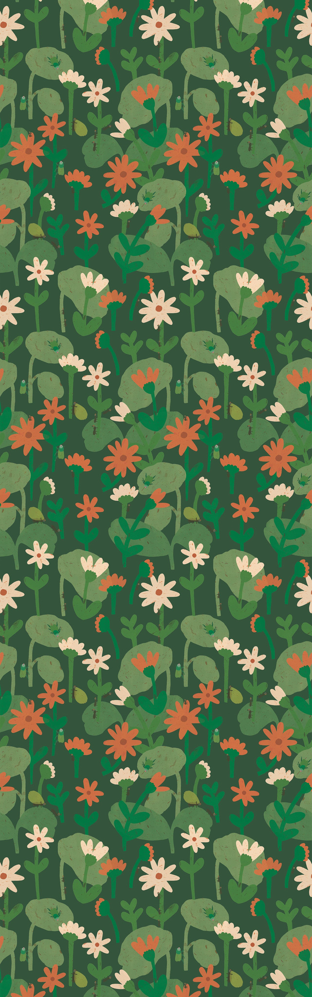 Blooming Daisies – Forest Green is a richly illustrated non-woven wallpaper by Lotte Dirks, part of the enchanting Into the Flowerfields collection. Featuring bold daisies in orange and cream, leafy greens, and little crawling bugs on a deep forest green backdrop, this wallpaper transforms every kids’ room into a miniature jungle full of life and learning.