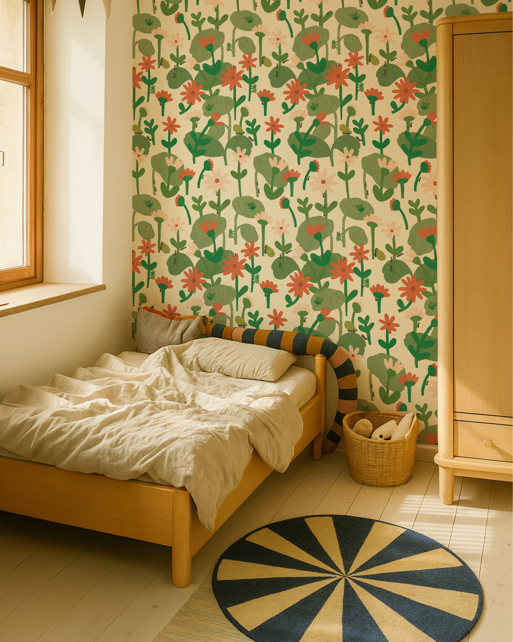 Children will love spotting the little beetles, ants, caterpillars, and snails hidden among the flowers, turning the wallpaper into a fun and interactive nature scene. Its bold yet balanced design brings joy and life to nurseries, bedrooms or playrooms while encouraging observation and storytelling.