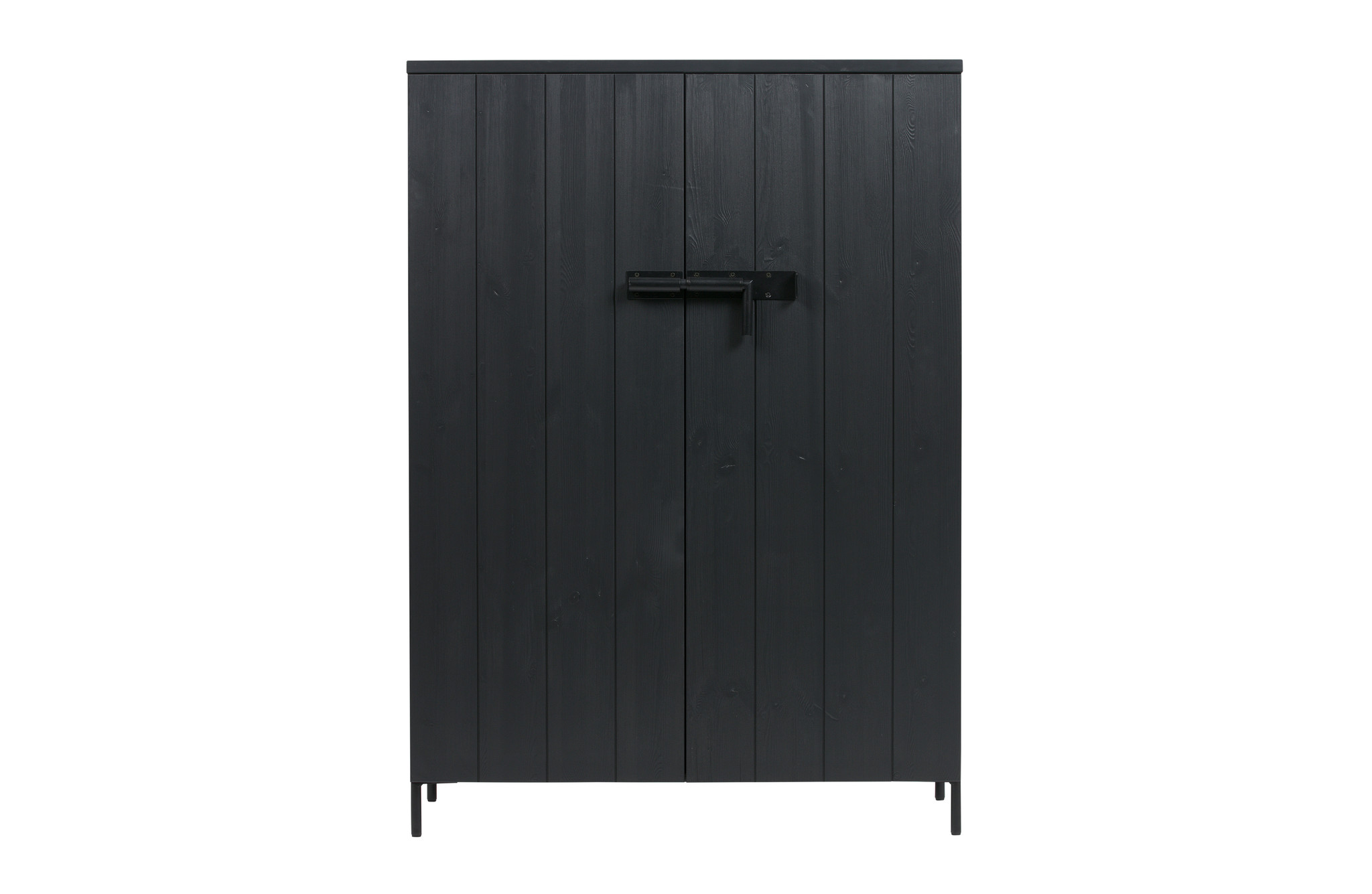 The Bruut 2-doors cabinet from the WOOOD collection is a sturdy storage cabinet and an addition to any room. The cabinet is made of pine wood that has a brushed finish. The legs and the gifted clasp are made of metal. Both the pine wood and the metal is finished in the color black. The Bruut cabinet has a height of 140.5 cm, a width of 100 cm and a depth of 41.5 cm.