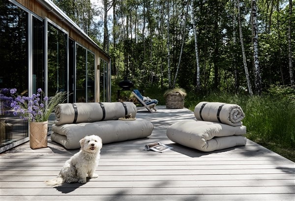 Our outdoor products are made from a first-rate 100 % acrylic dralon fabric, stain-resistant, and water-repellent. In the rain, the material makes water slide off the surface. Please do always bring your OUT product inside in heavy rain to care for it the best way possible. Use a damp cloth and wipe the OUT futon clean if needed.