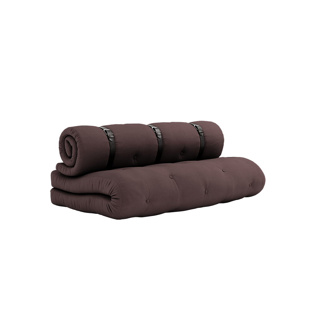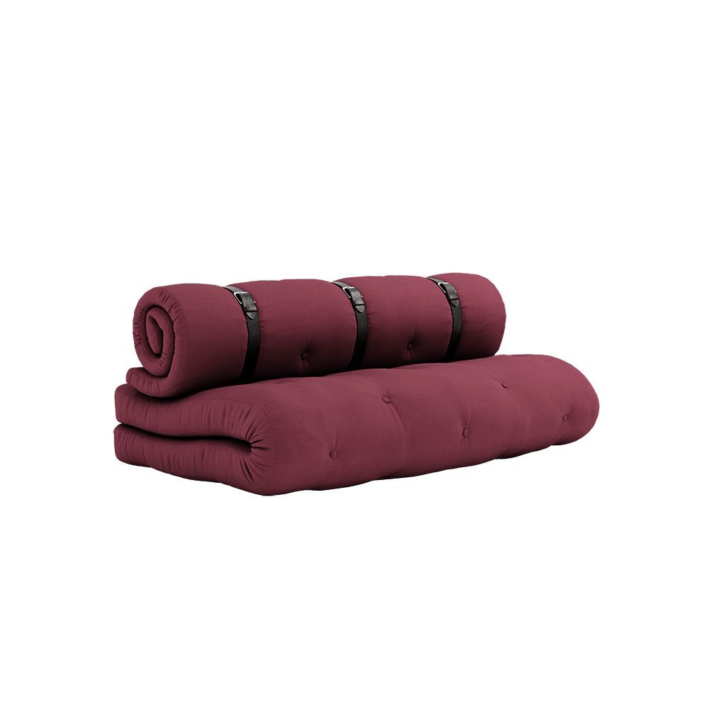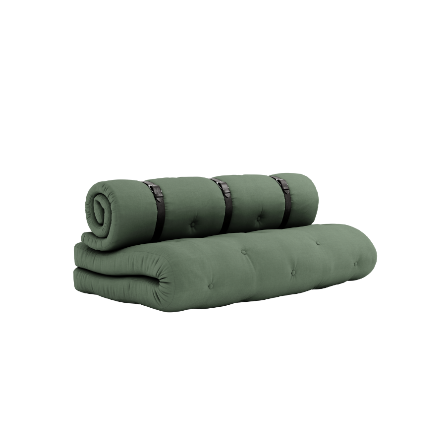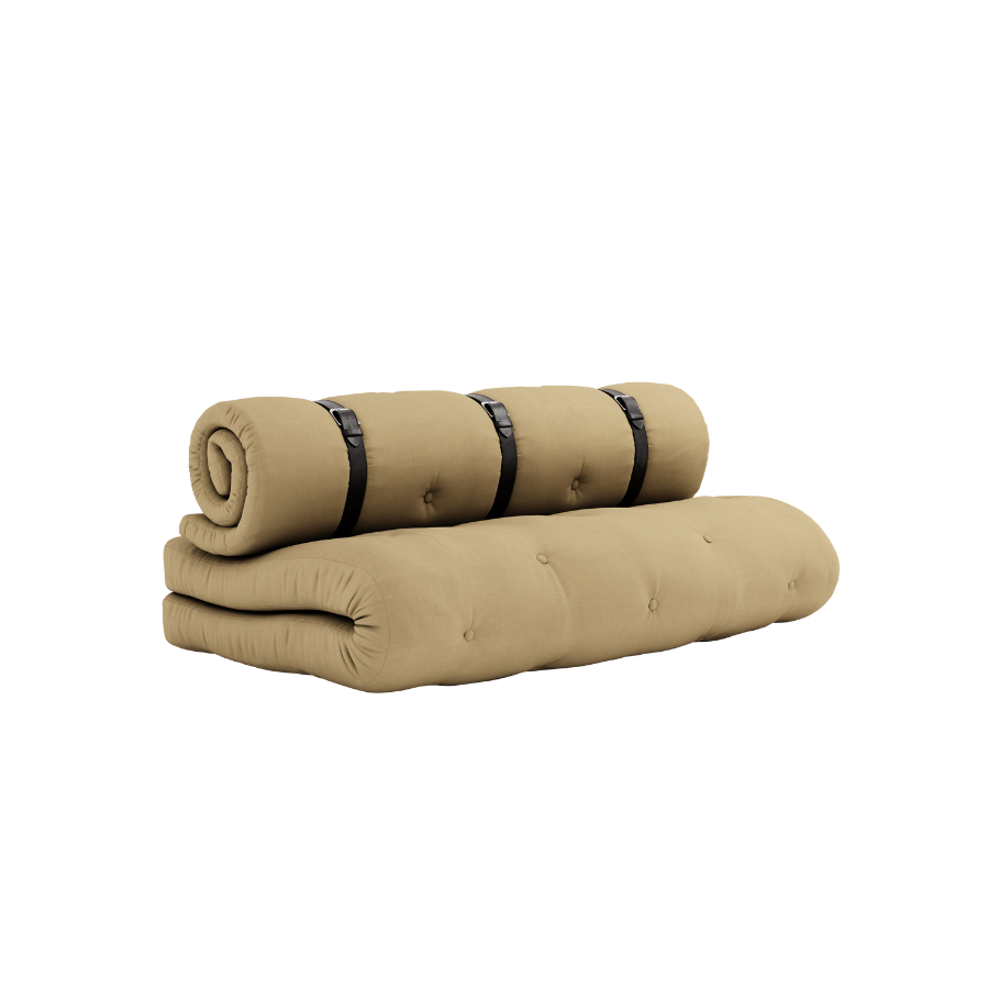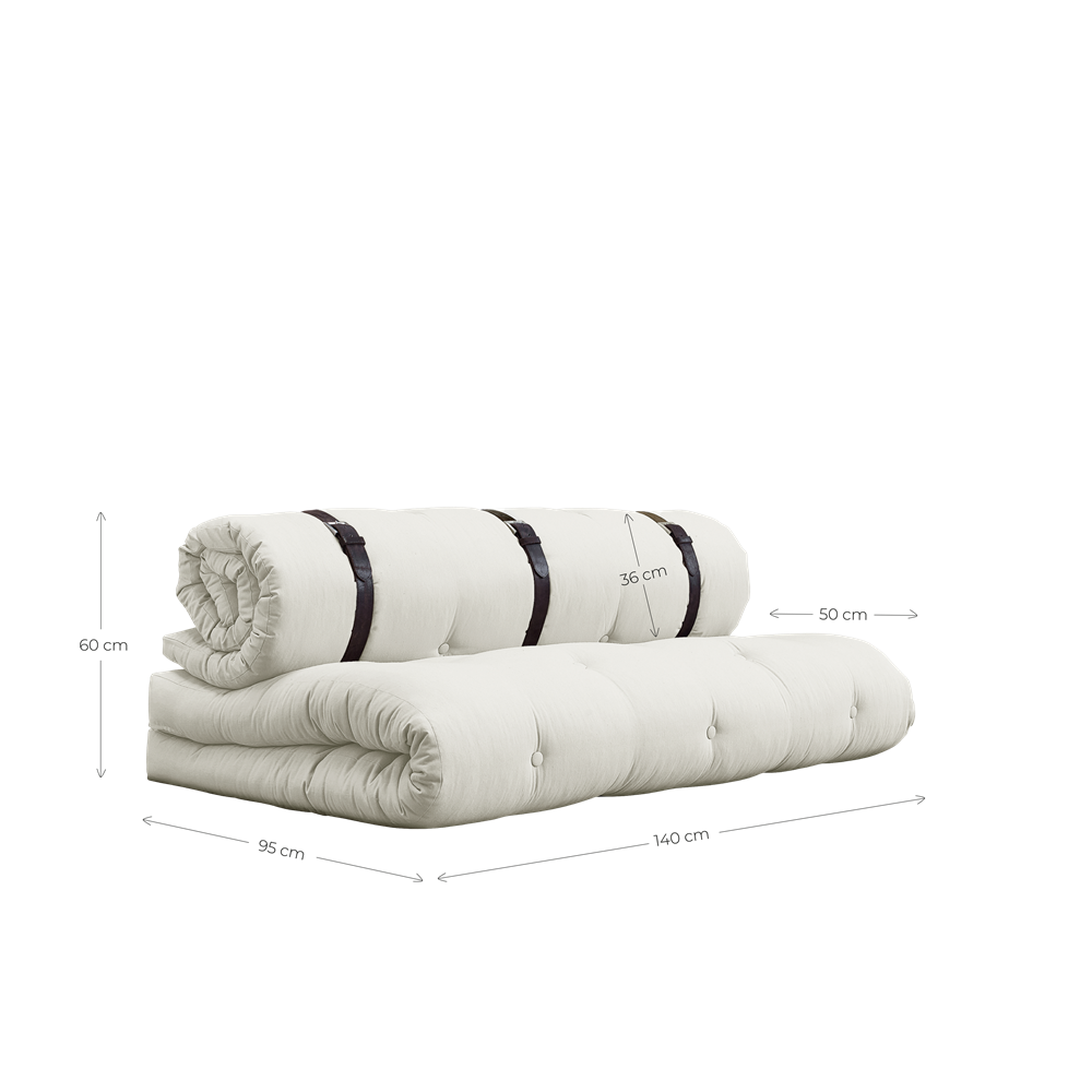 Sit . Roll . Sleep Buckle-Up easily transforms from a comfortable seating to a functional guest accommodation in three easy steps. Simply unfold the seat cushion, unbuckle the rolled back support, then stack both futons to create a luxurious, thick bed that will deliver cushioned comfort all night long. Our futons are wider and thicker than traditional futons. Buckle-Up is highly functional, stylish, and a great way to maximize your living space. Material Cover: 80 % cotton + 20 % polyester Top mattress: 5 cm recycled mixed fibre mattress with a core of 2 cm foam. Seat mattress: 12 cm recycled mixed fibre mattress with a core of 4 cm foam. Mattrass fill material: 90-95% cotton + 5-10% polyester. Care instructions: Our mixed fabric is made from 80 % cotton and 20 % polyester. Do only clean with a dry cloth to prevent stains. Max. weight 100 kg