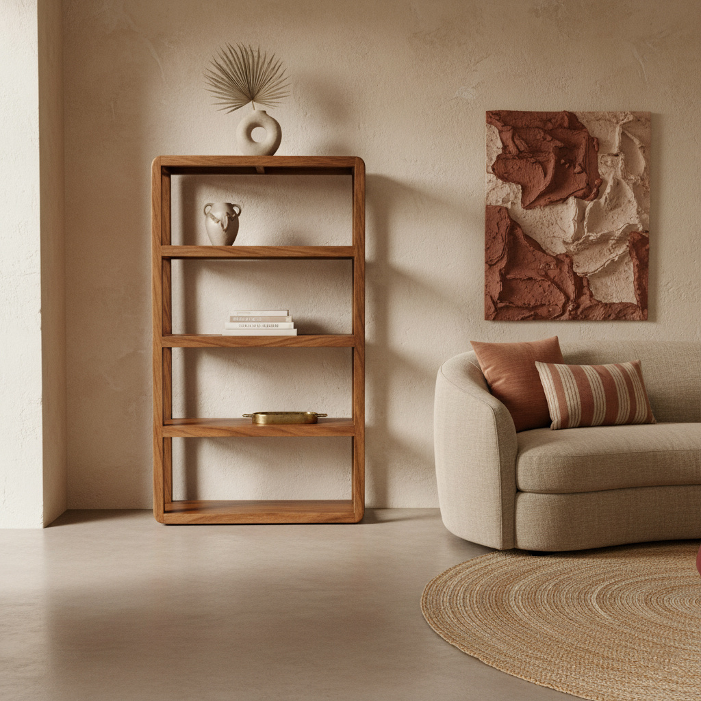 Creëer een interieur vol karakter en warmte met het Bullnose rek van mangohout, een tijdloos meubelstuk dat elk interieur verrijkt.