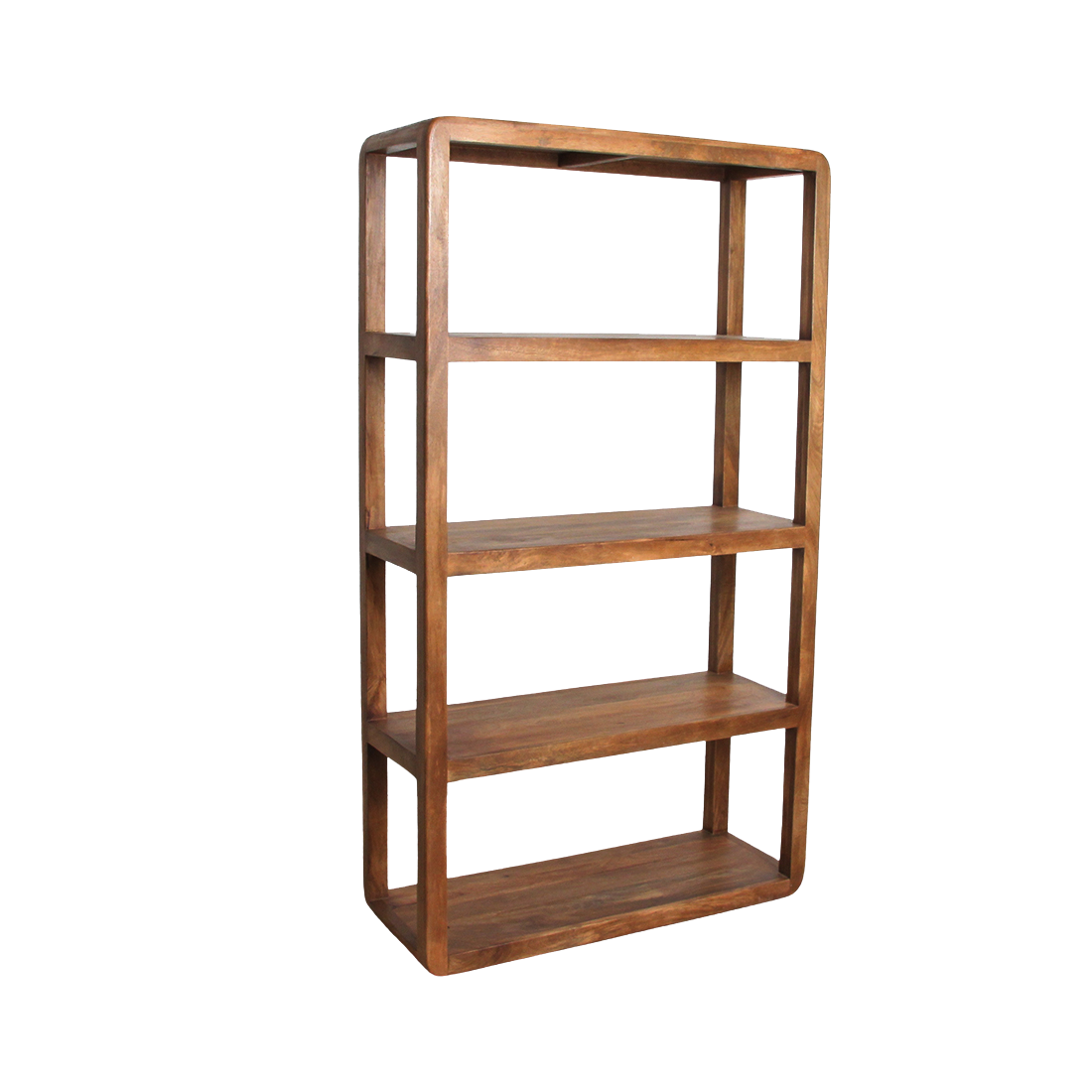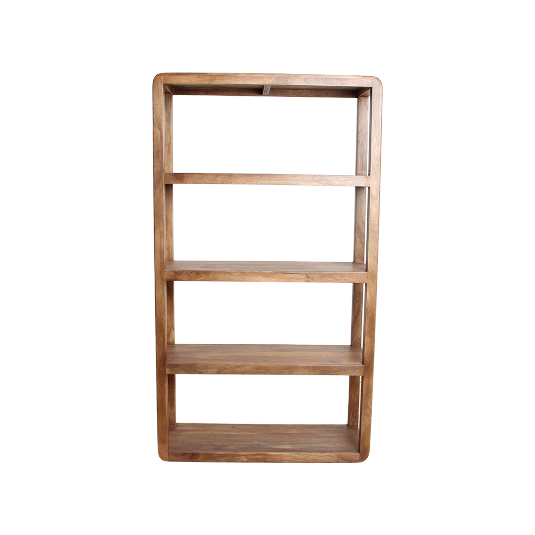 Breng warmte en karakter in je interieur met het Bullnose rek van mangohout. Dit rek heeft vijf ruime planken en een organische, afgeronde vorm, waardoor het zowel praktisch als stijlvol is. Gebruik het rek voor boeken, decoratieve items of verzamelobjecten en geef je woonkamer, studeerkamer of hal een unieke, robuuste uitstraling.