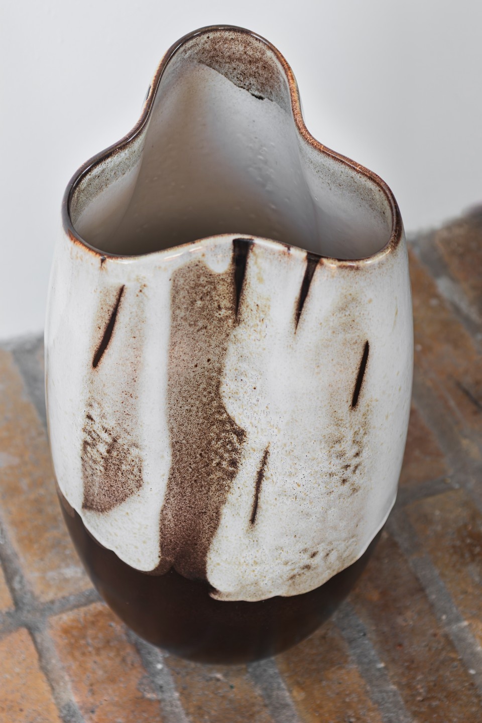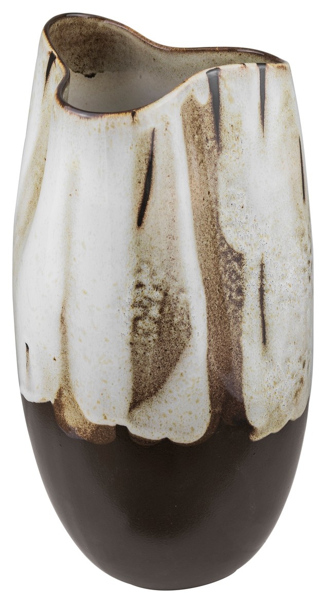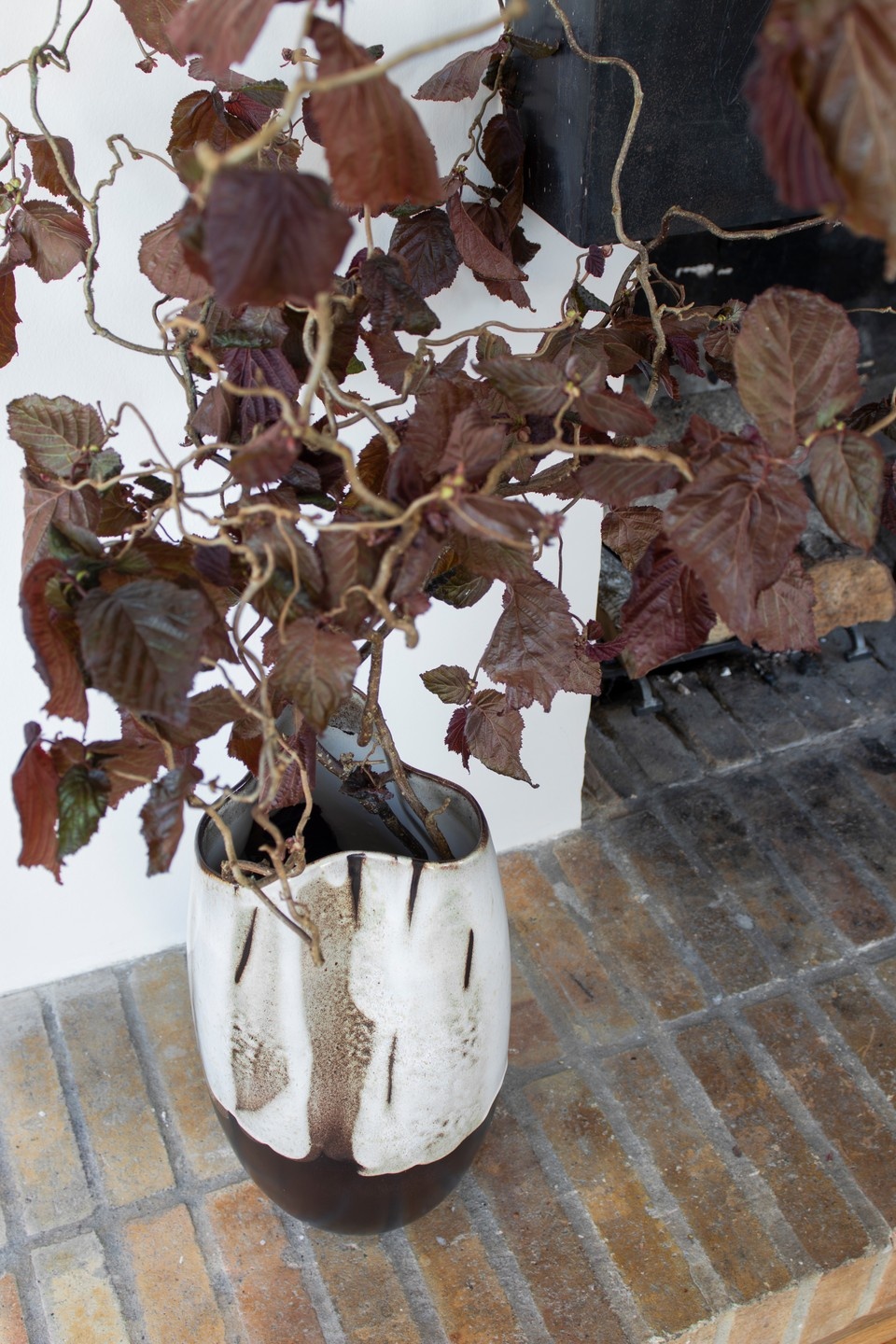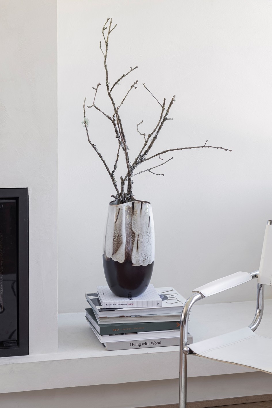 The BY HAND curve vase from Mette Ditmer blends modern form with traditional craftsmanship. Its organic, asymmetrical shape adds a playful touch. A semi-matte dark brown base contrasts with a glossy off-white glaze that flows across the surface, creating soft transitions in warm, earthy tones. The flowing glaze and natural variation make each vase truly one of a kind. Use it as a decorative statement on its own or fill it with seasonal branches from the garden. - Material: Stoneware - Washing/Care Instructions: Wash by hand or use a damp cloth. We recommend ordinary dishwashing liquid. The product is not suitable for the dishwasher.
