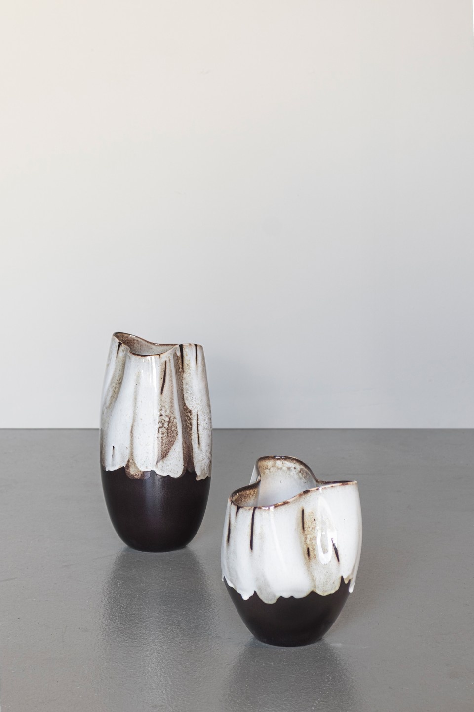 The BY HAND curve vase from Mette Ditmer is defined by its organic shape and expressive surface. A semi-matte dark brown core is contrasted by a glossy off-white glaze that flows asymmetrically over the edge, creating soft brown tones where the two finishes meet. The hand-glazed surface and irregular shape make each vase truly unique. Use it with seasonal flowers or let it stand alone as a decorative element in your home. - Material: Stoneware - Washing/Care Instructions: Wash by hand or use a damp cloth. We recommend ordinary dishwashing liquid. The product is not suitable for the dishwasher.