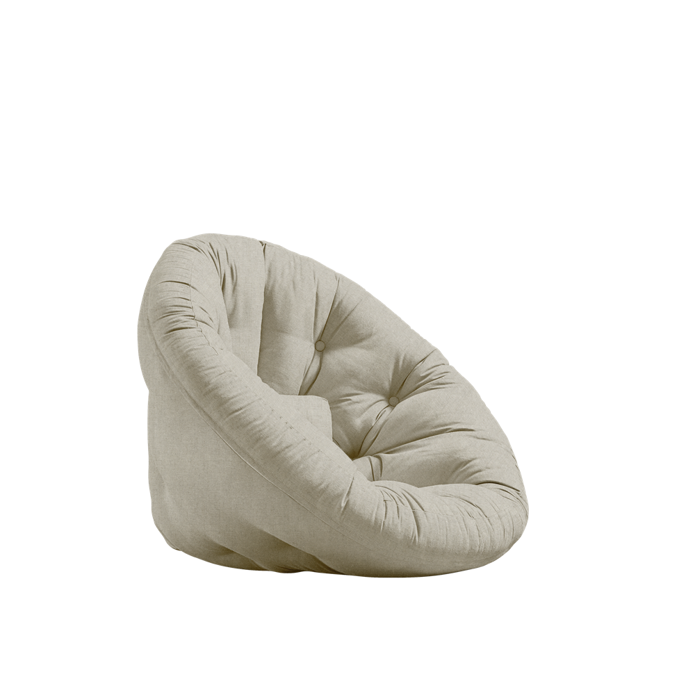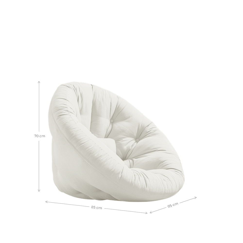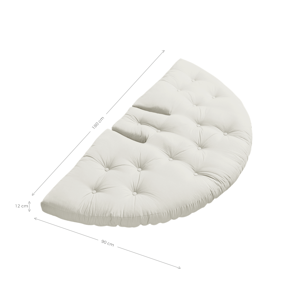 Sit . Unstrap . Nap This comfortable, highly versatile futon comes in three sizes to appeal to people of all ages and shapes. As the Nido chair, it offers a cosy nook where you can curl up for a phone conversation or settle down to read email on your tablet. Share the larger Nest chair with your toddler at story time or give them their own Mini Nido. Undo the four velcro straps at the back of your futon chair and it quickly becomes a half-moon futon, suitable for a nap, meditation, or just lounging. Put two open Nidos together to make an inviting circular bed that’s sure to impress overnight guests. Design by Anders Backe, Anne-Sofie Voss, Ida Sofie Lange, Lars Wigh and Troels Rask Pedersen for Karup Design. Material Cover: 80 % cotton + 20 % polyester Mattrass fill :12 cm recycled mixed fibre mattress with a core of 4 cm foam Care instructions: Our mixed fabric is made from 80 % cotton and 20 % polyester. Do only clean with a dry cloth to prevent stains. Max. weight 90 kg