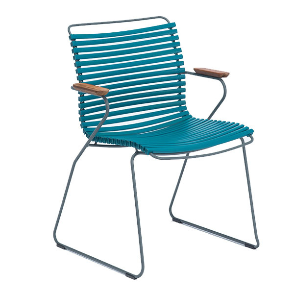 CLICK Dining chair. CLICK chair is simple, honest and ergonomically well thought out. It is beautiful in its repetition around the table and because the lamellas can be replaced, you can mix and change the colours as often as you like. CLICK Dining chair comes in 3 different variants - with or without armrests. CLICK dining chairs are stackable. Material: Powder coated metal for outdoor use with PP plastic lamellas and bamboo armrests.
