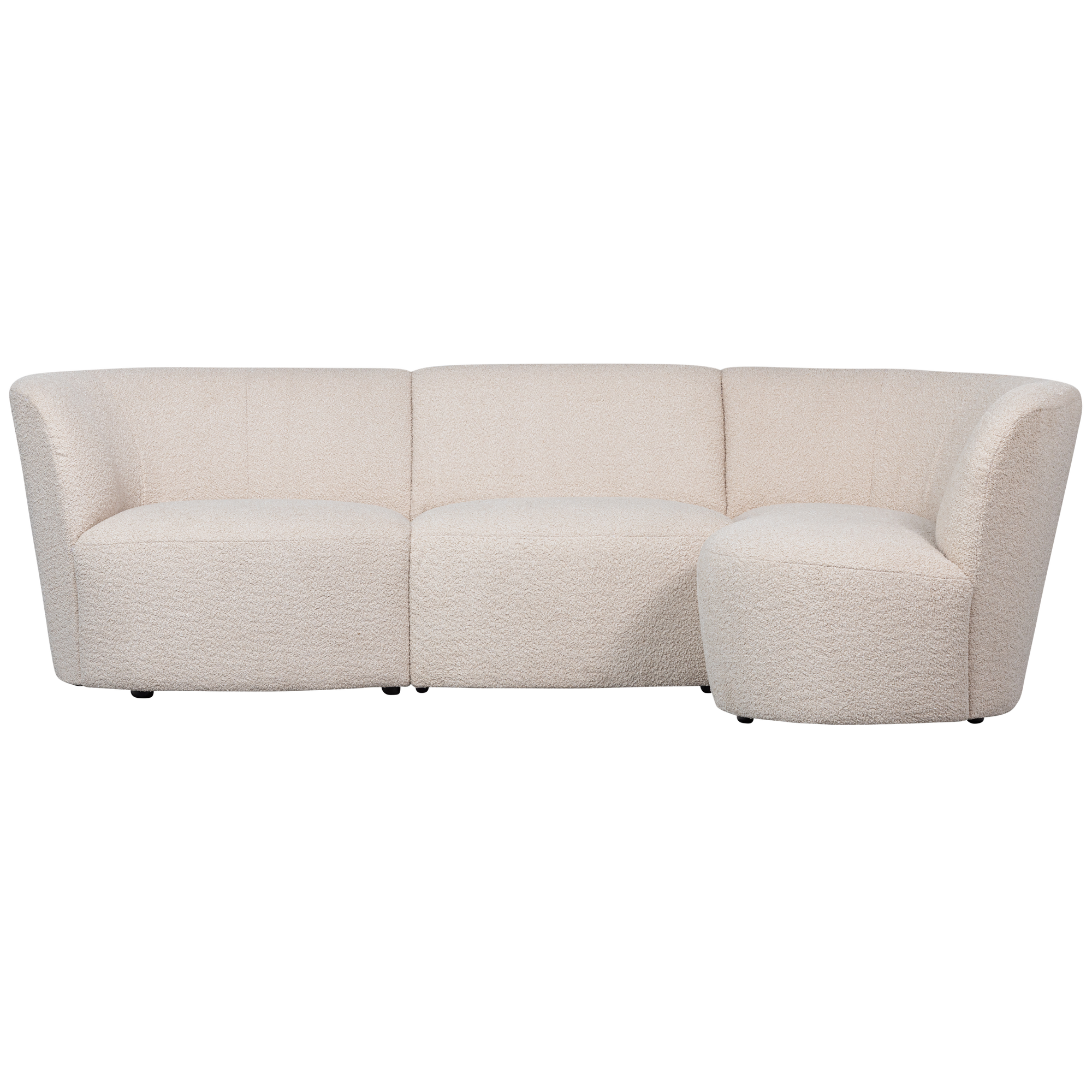 - 3-seater chaise longue sofa - Playful design - Upholstered in a woolly boucle (100% polyester) - H 70 cm x W 230 cm x D 138 cm The Coco series, from the collection of Dutch interior design brand WOOOD, is very suitable for large and small living spaces. The Coco elements are very compact in size, have a softly rounded design and can also be placed loose in the room because of the upholstery on each side. Material Our soft Almón boucle has an elegant texture that brings instant warmth to the home. The boucle fabric has a Martindale of 60,000, which means it is suitable for fairly intensive use. The dense weave ensures the strength of the fabric, which means the Almón boucle will not wear or tear easily. Each colour also has a high colour fastness, but it is recommended to avoid direct sunlight to avoid colour shades. Dimensions - Height: 70 cm - Width: 230 cm - Depth: 138 cm - Seat height: 42 cm - Seat width: 190 cm - Seat depth: 52/118 cm - Armrest height: 70/28 cm - Banister thickness: 20 cm - Leg height: 2 cm - Leg thickness: ø 3 cm - Weight capacity: 100 kg per seat Care instructions Dab any stains dry immediately with a clean cloth or tissue. Do not rub! Most liquids can be removed with lukewarm water. Use a gentle circular motion from the outside inwards. For years of stain protection, the fabric can be impregnated. Impregnate the seating as soon as possible after receipt to ensure immediate protection. Delivery Coco elements are delivered individually. To protect hard floors, place felt glides on the underside of the plastic floor protectors.