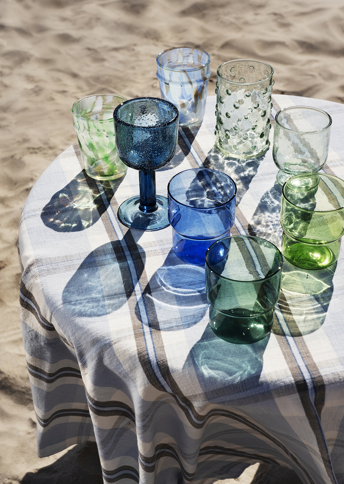 Mouth-blown drinking glass from firozabad – the centre of India’s glass manufacturing industry. this Drinking glass brings a relaxed mood to the table, with blue, aqua, taupe and clear tones scattered as soft glass spots. a unique pattern and play of colour created by glass spots lends character to any setting. playful colour composition and a humorous expression make every piece feel informal yet considered. handmade craftsmanship gives each item slight differences, adding quiet charm rather than perfection. this Drinking glass is ideal for water, juice or a small cocktail, and it sits comfortably in the hand thanks to its rounded form. available with a matching water jug, it works as a simple everyday set or as an easy refresh for guests and gatherings.