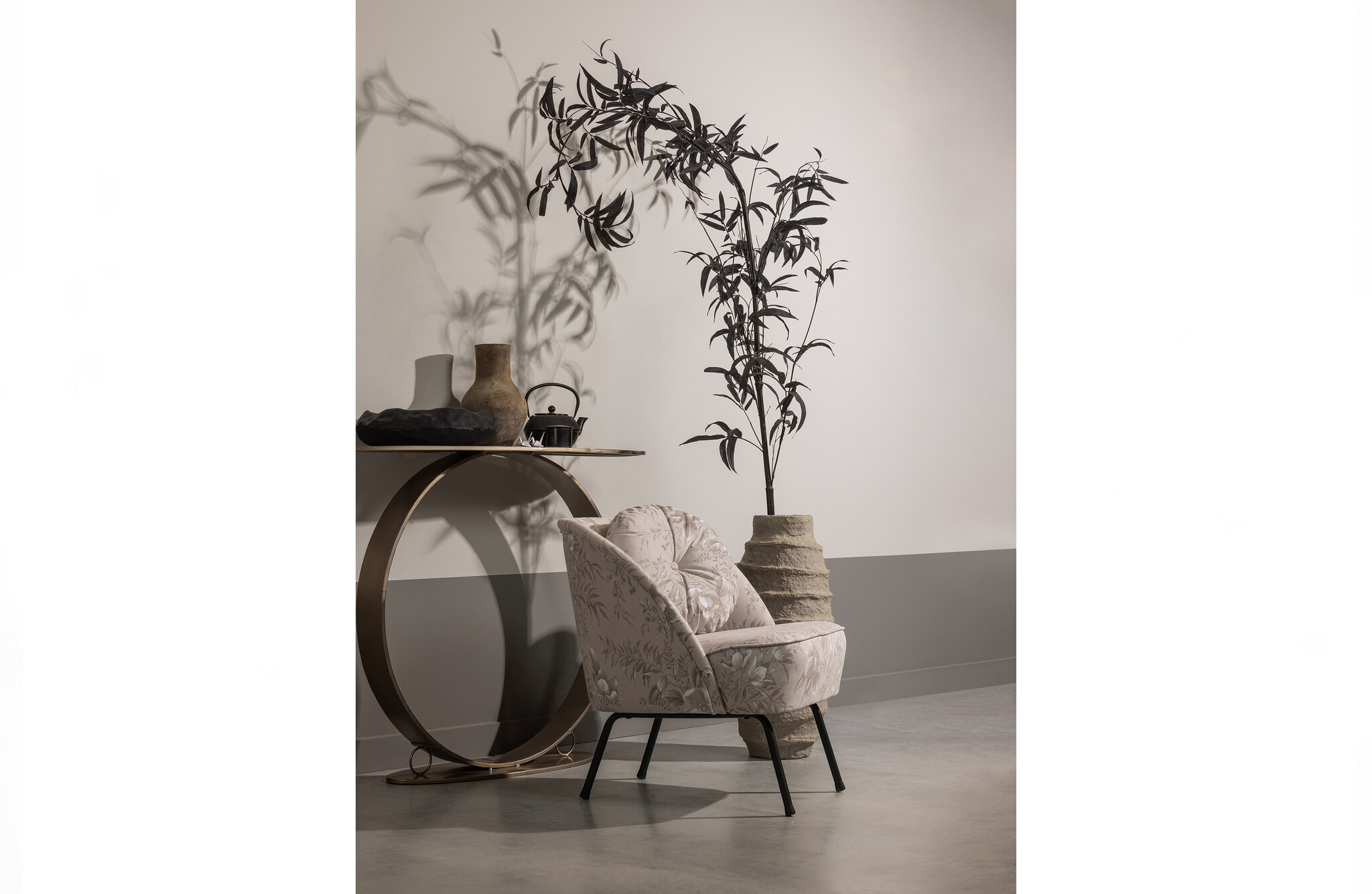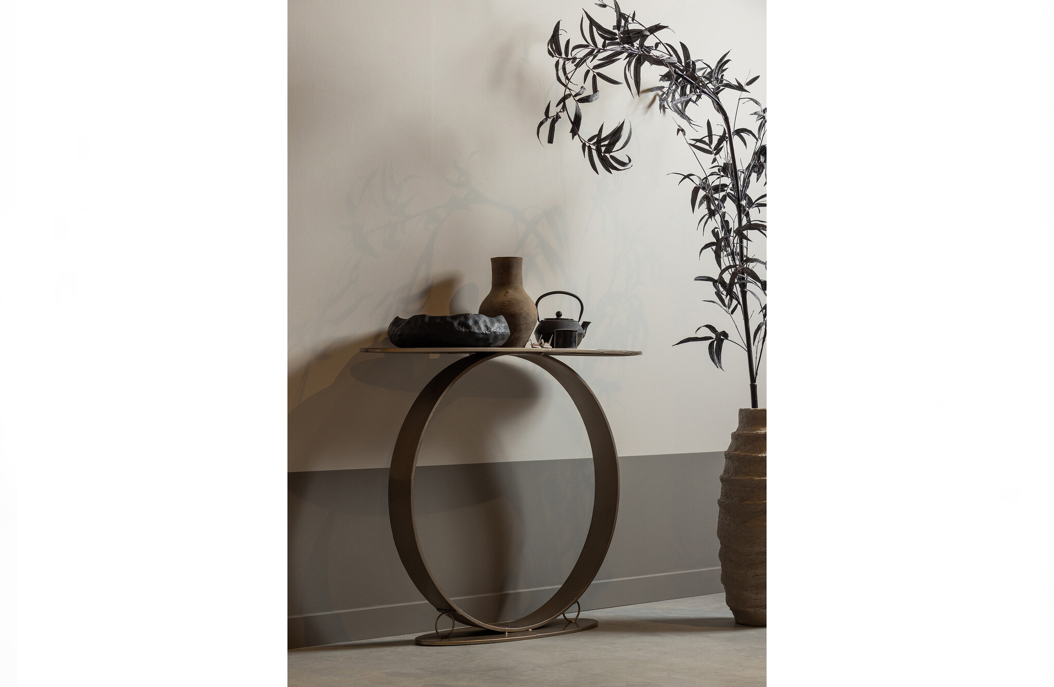 - Airy side table with unique design - Made of metal with a champagne-coloured finish - With a spacious table top for the most beautiful decorations - H 87 cm x W 110 cm x D 35 cm This slim side table comes from the collection of the Dutch interior brand Material: Metaal