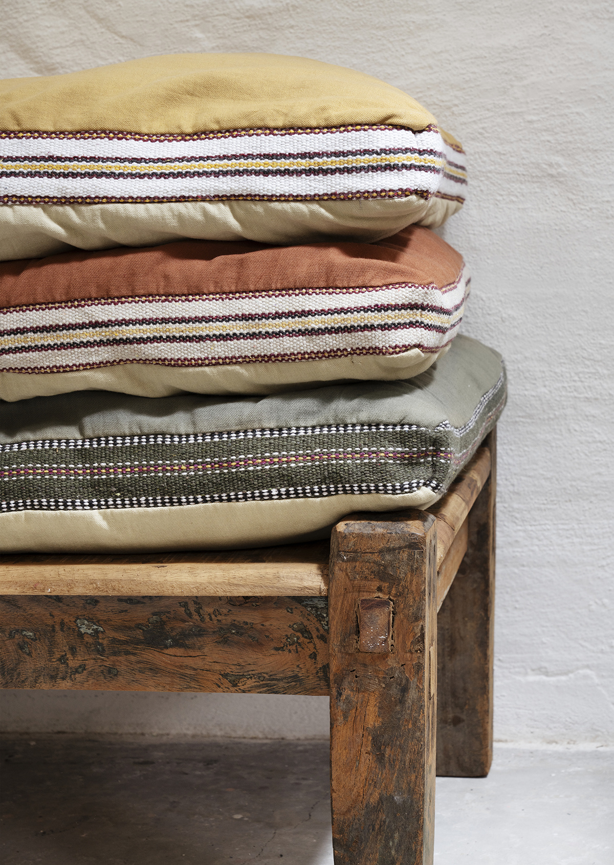 This Cotton mattress brings calm, grounded colour to any space with its warm rust and neutral sand palette. Double-sided mattress in warm rust and neutral sand. The striped contrast piping separates the two sides and evokes traditional Danish folk textiles. Sized to fit several pieces in the collection, but can also be used directly on the floor or terrace. Removable polyester filling. Crafted in India, it offers a relaxed, informal place to sit or lie down, whether layered on furniture or styled as a standalone piece.