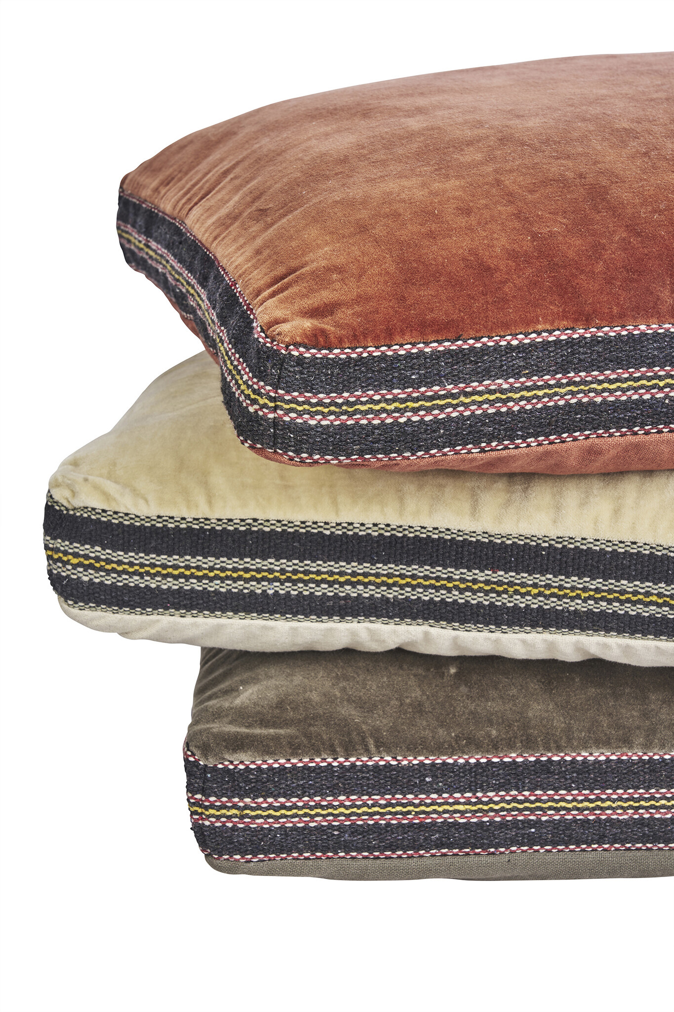 This seating mat is a versatile addition to any space, crafted in India with a blend of cotton and polyester filling. It is available in green and black, featuring a soft velour side and a robustly woven cotton side in matching hues. A coarsely woven cotton band with stripes separates the two layers, adding texture. Suitable for use in a chair or directly on a terrace deck, this combines comfort and style for various settings.