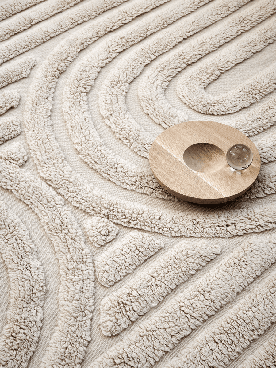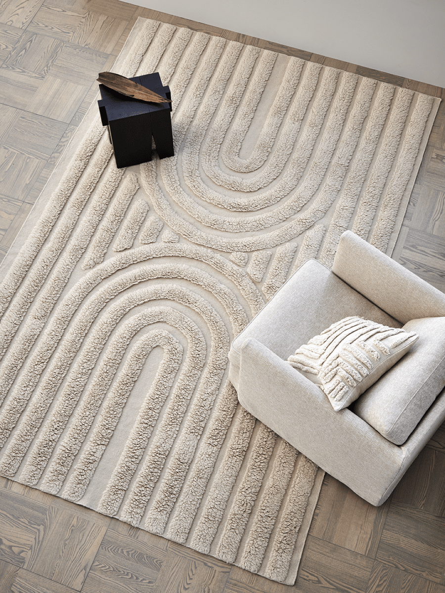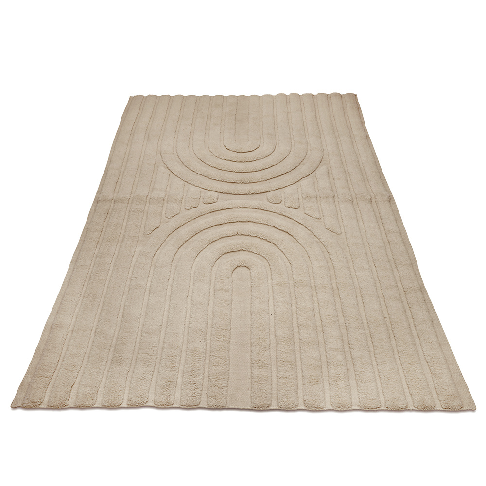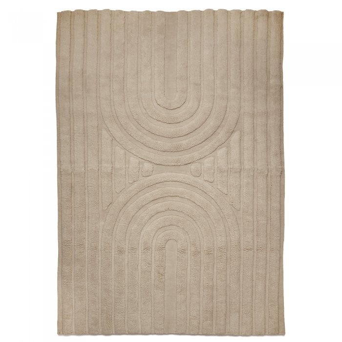 This hand-woven wool rug features an arched pattern that is both visually stunning and tactilely pleasing. The high pile areas are crafted in pile technique, while the low areas are crafted in a classic flat-woven technique. The combination of high and low creates a wavy, textured appearance that is both elegant and inviting. The light beige color of the rug will complement any room in your home and will add a warm and cozy touch to your space. Made of the softest wool, this rug is durable, long-lasting and sustainable. It will be a beautiful addition to any home decor.