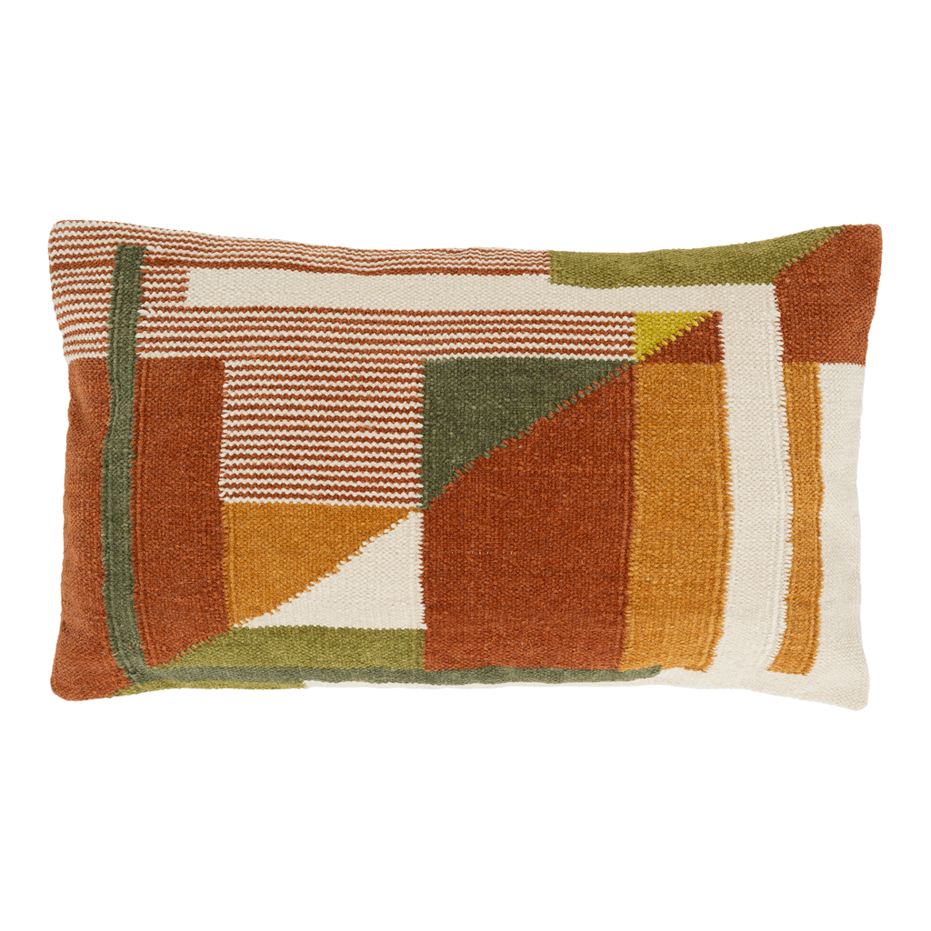 Bright and bold, this rectangular cushion brings a pop of geometric joy. Soft velour-like fabric in warm tones instantly enlivens your room. A playful pillow with sustainable filling.