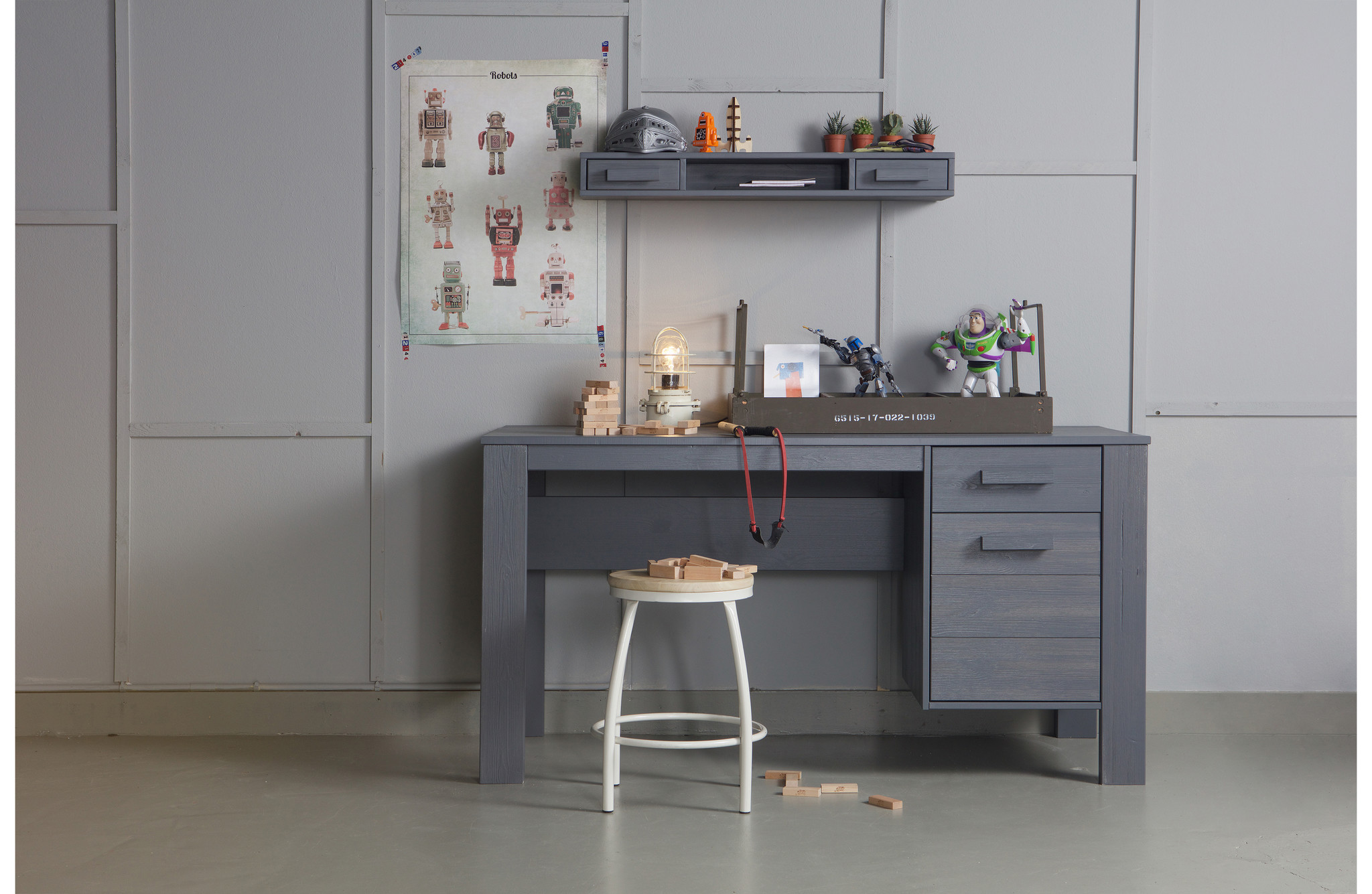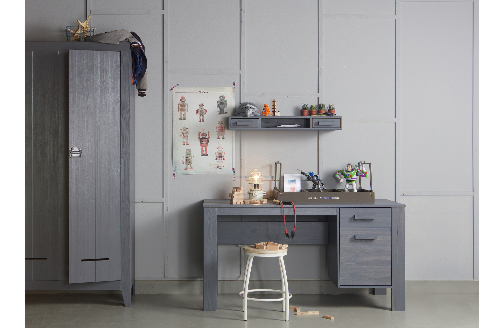 The Dennis (hxwxd) 74x141x59 cm desk is an in-house production of the Dutch brand WOOOD. The desk has a built-in drawer and a cupboard. The Dennis desk is made of FSC-certified pine, has a brushed finish and is sprayed with a waterborne paint in the colour steel grey. This desk is part of the Dennis room, this room consists of a sofa bed or a bed without walls, a desk, a closet, a storage box, a bedside table and a wall shelf. Brushed wood This piece of furniture is made of brushed wood. The veins and knots are accentuated by brushing so that the wood gets a worn out appearance. This treatment can make unevenness, small cracks and knots extra visible. These are characteristics of the aged wood. This makes each copy unique! The Dennis desk has a weight of 28 kg. This article is delivered as a simple kit with a clear assembly instruction.