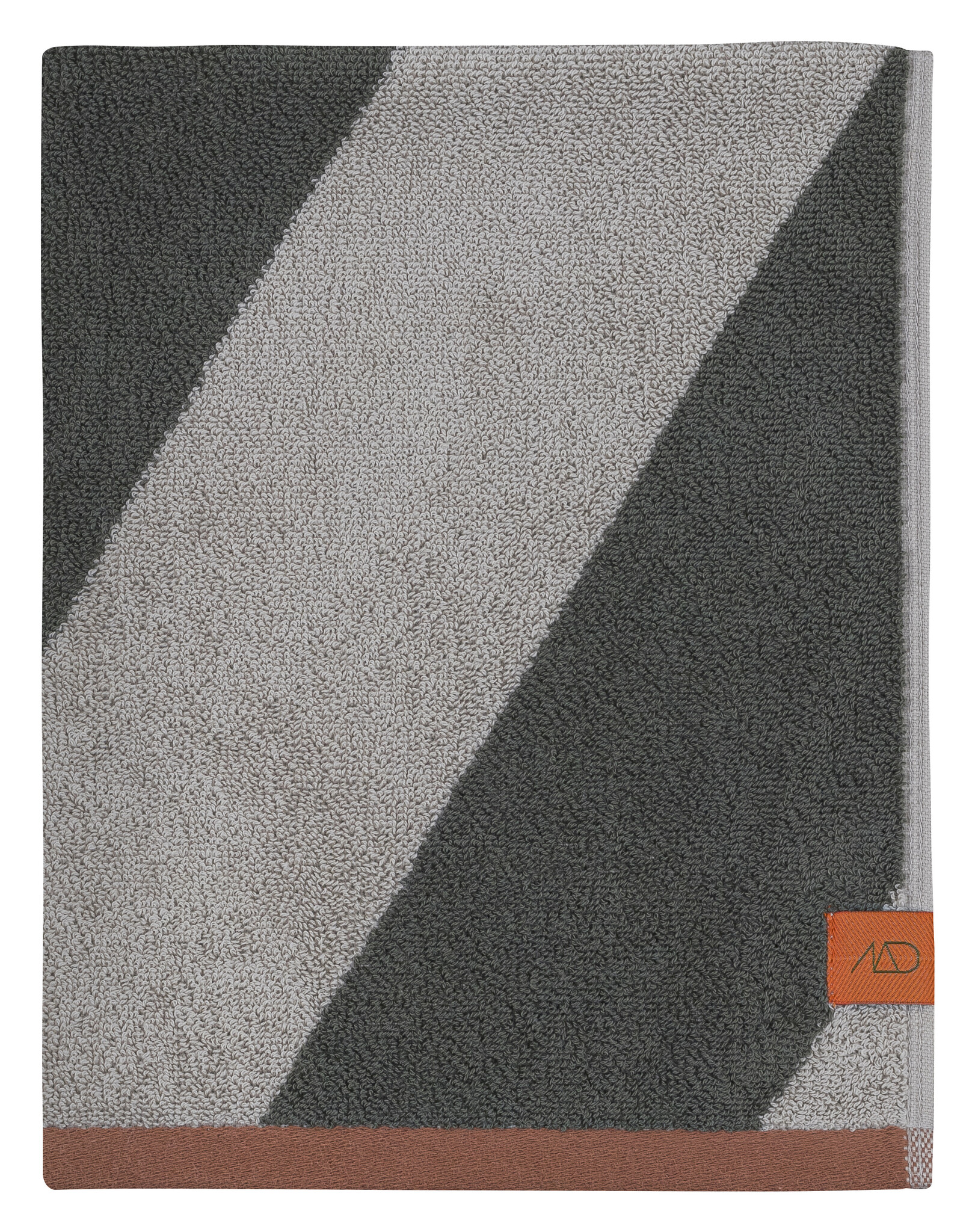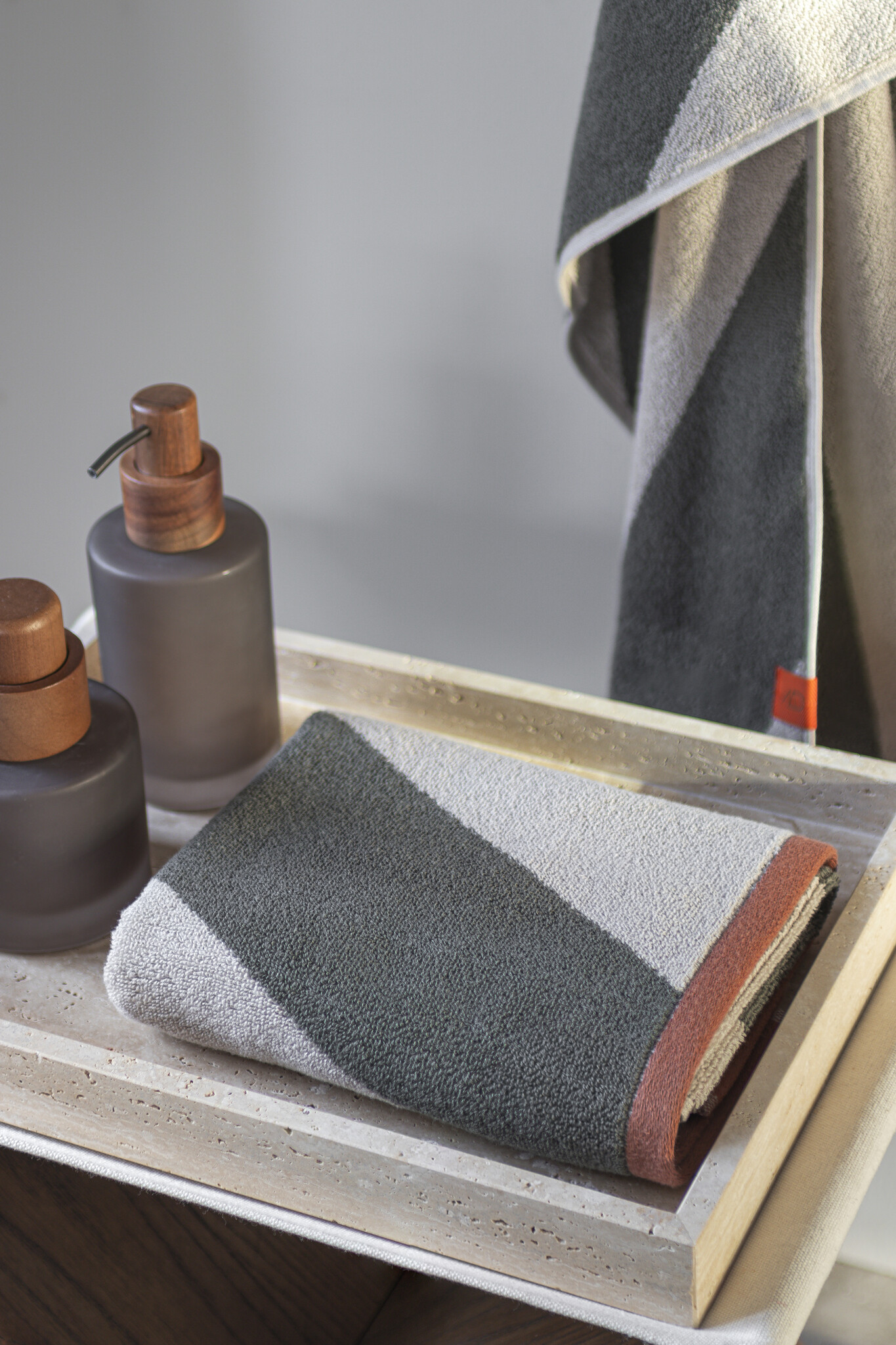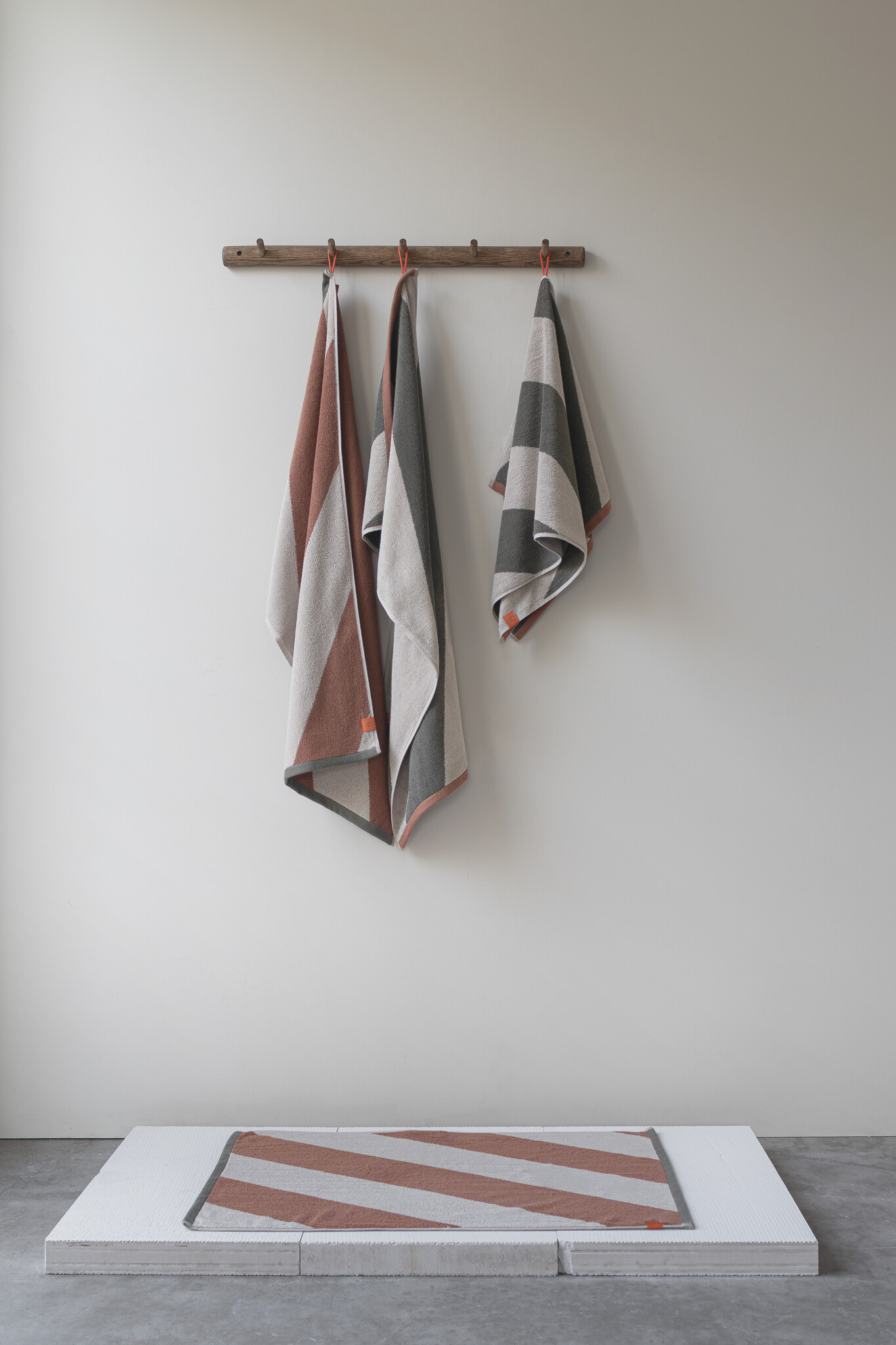 Add warmth and earthy tones to your bathroom with the DIAGONAL guest towels from Mette Ditmer. The diagonal stripes in olive green and sand are complemented by a brick red border, adding a subtle yet stylish contrast. The orange loop serves as a decorative and practical detail, complementing the towels’ modern design.