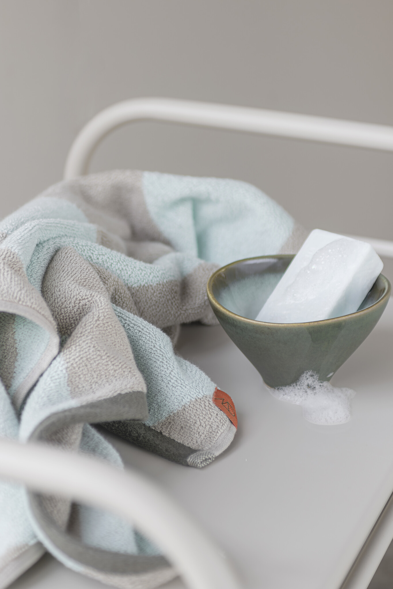Bring a splash of colour to your bathroom with the DIAGONAL guest towels from Mette Ditmer. Wide diagonal stripes in mint and sand create a beautiful balance of fresh and warm tones, while the olive green border provides a calming contrast. A bold orange loop and label add a playful finishing touch, making the towels both functional and decorative. The towels are OEKO-TEX® 100 certified and have a soft and absorbent surface made from organic cotton.