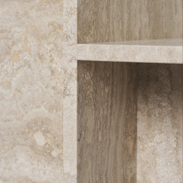 Originally inspired by Japanese minimalism, the Distinct Side Table explores the creation of complex structures based on a single element. The minimalist construction creates a contrast to the richness of the travertine's earthy textures. With the natural and diverse qualities of the sand-coloured limestone, it provides rawness and tangibility that highlight the architectural character of the furniture piece. / Powder Coated Metal