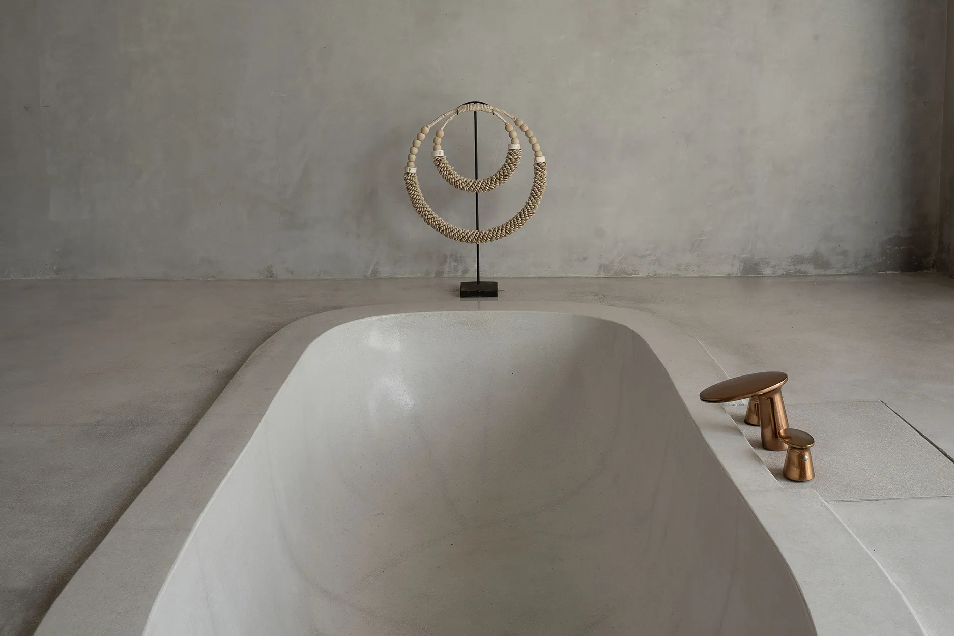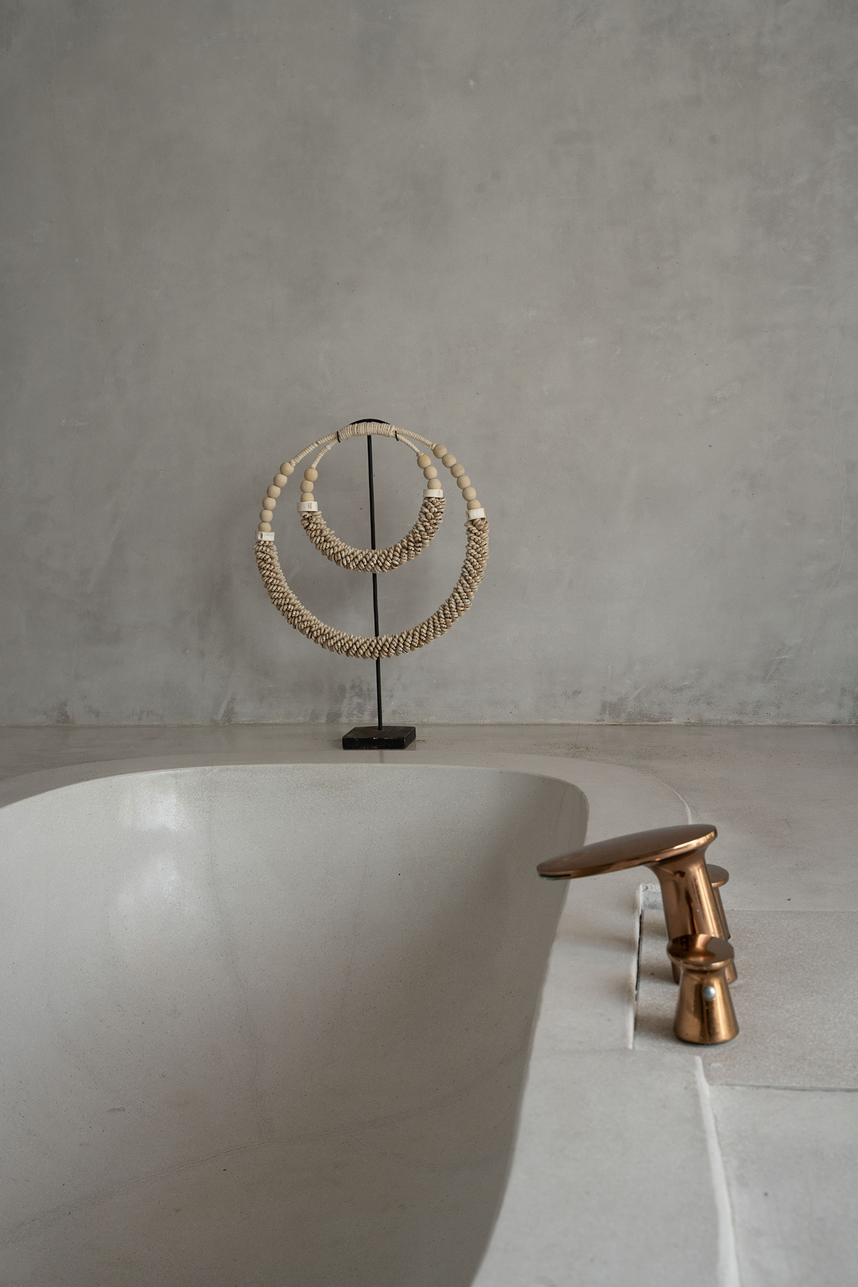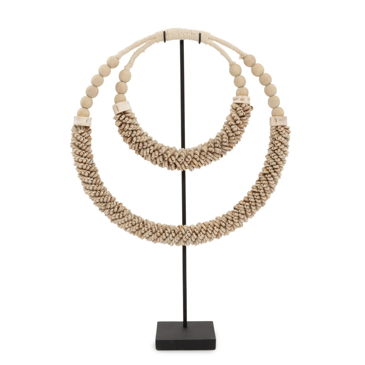 Deze opvallende decoratie op standaard verdient een plekje in uw huis! Op een kast, in de badkamer of zelfs op een overdekt terras of in de tuin - het zal overal prachtig staan. De twee cirkels zijn versierd met schelpen, bot, houten kralen en katoentouw. Allemaal gemaakt door echte Balinese ambachtslieden.