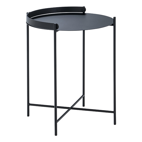 EDGE tray table is suitable for both indoor and outdoor use. The half ring shaped handle makes it easy to move the table between the living room and the garden, and when laid down it functions as a table edge making sure everything stays in place. DIMENSIONS: Ø46 x H: 53 cm MATERIALS: Powder coated metal Top: Black Handle: Black Legs: Black DESIGNED BY: Roee Magdassi