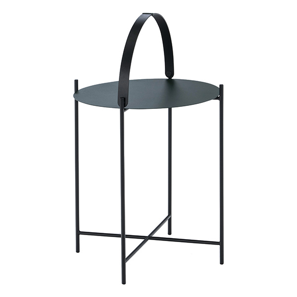 EDGE tray table is suitable for both indoor and outdoor use. The half ring shaped handle makes it easy to move the table between the living room and the garden, and when laid down it functions as a table edge making sure everything stays in place. DIMENSIONS: Ø46 x H: 53 cm MATERIALS: Powder coated metal Top: Pine Green Handle: Black Legs: Black DESIGNED BY: Roee Magdassi