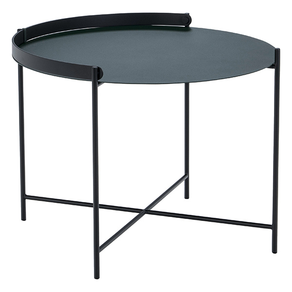 EDGE tray table is suitable for both indoor and outdoor use. The half ring shaped handle makes it easy to move the table between the living room and the garden, and when laid down it functions as a table edge making sure everything stays in place. DIMENSIONS: Ø62 x H: 46 cm MATERIALS: Powder coated metal Top: Pine Green Handle: Black Legs: Black DESIGNED BY: Roee Magdassi
