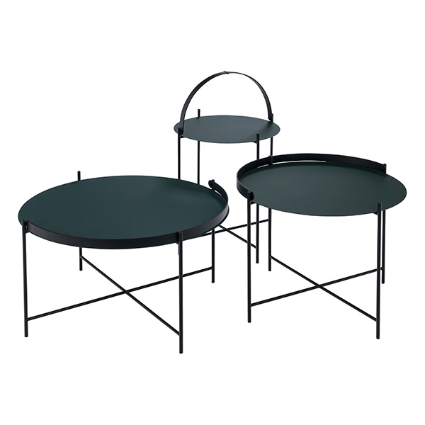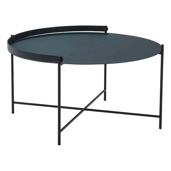 EDGE tray table is suitable for both indoor and outdoor use. The half ring shaped handle makes it easy to move the table between the living room and the garden, and when laid down it functions as a table edge making sure everything stays in place. DIMENSIONS: Ø76 x H: 40 cm MATERIALS: Powder coated metal Top: Pine Green Handle: Black Legs: Black DESIGNED BY: Roee Magdassi