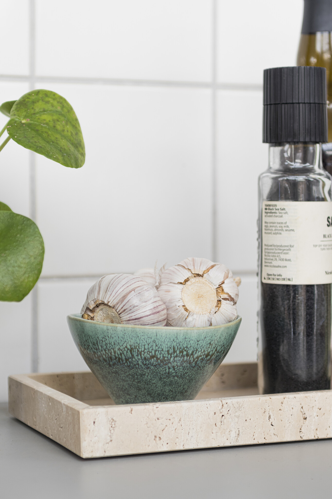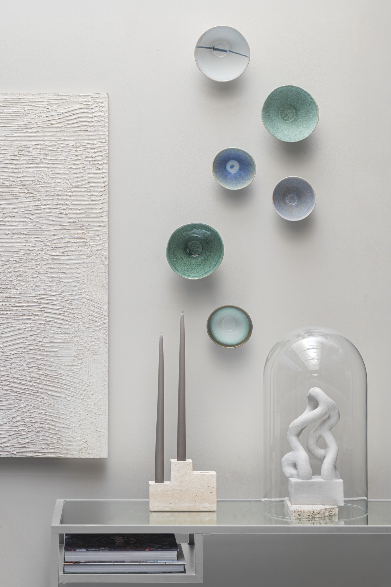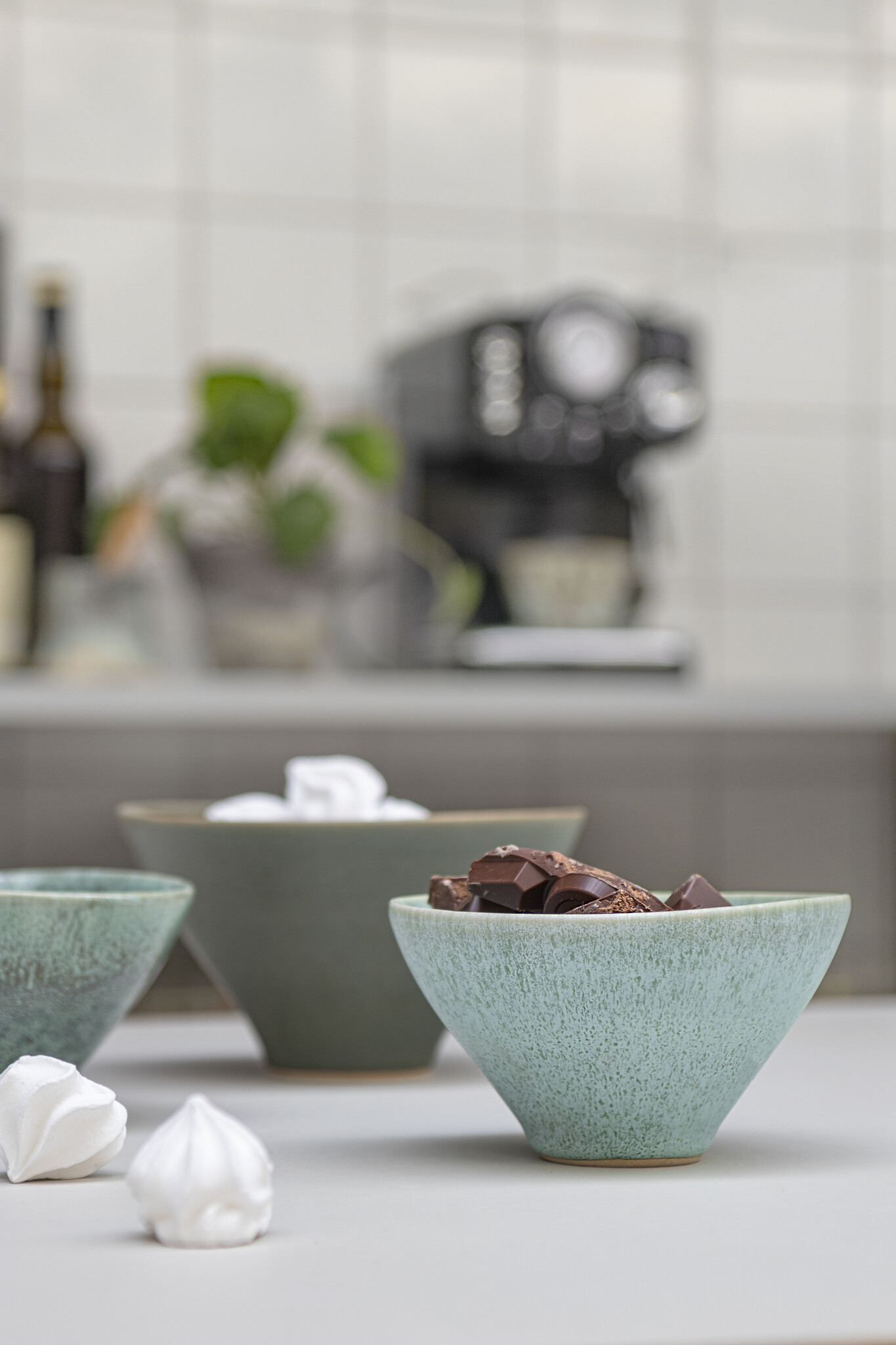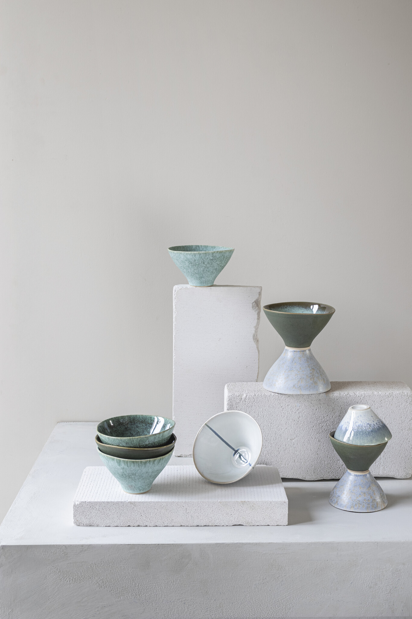The small ELEMENTS bowls from Mette Ditmer are made from stoneware. Each bowl is decorated with different green glazes, featuring both glossy and matte finishes. The playful use of glazes and varying green shades gives each bowl its own character, ensuring no two are exactly alike.