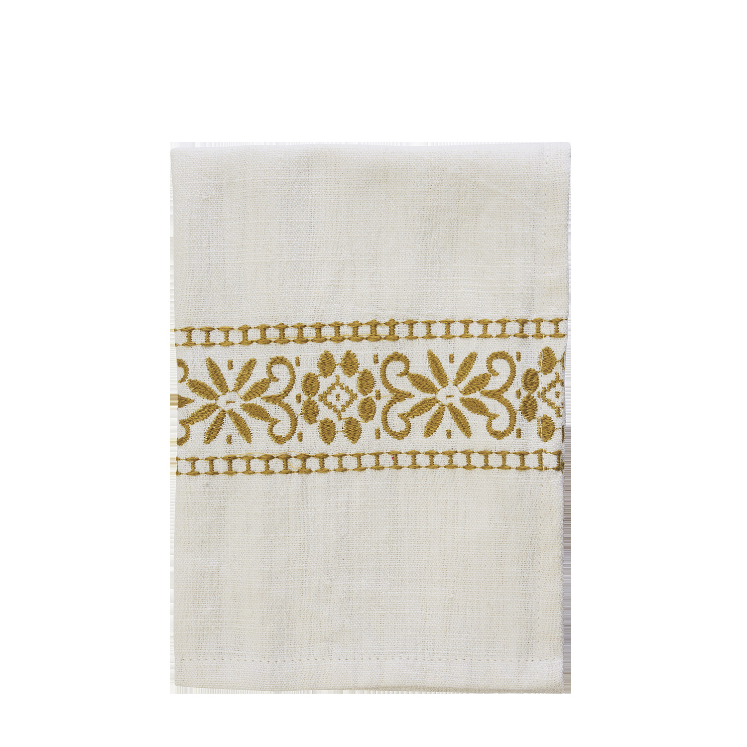 This embroidered kitchen towel is crafted from durable woven cotton, offering a blend of tradition and craftsmanship suitable for any kitchen. Made in India, it is available in off white and yellow, allowing for a mix and match of colors and patterns to fit various preferences. This product reflects a design inspired by kitchens of the past, providing both functionality and aesthetic appeal.