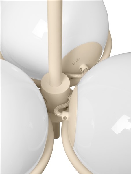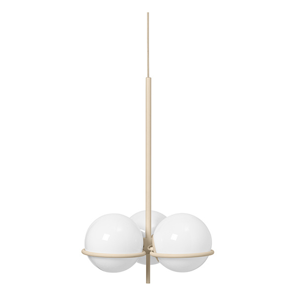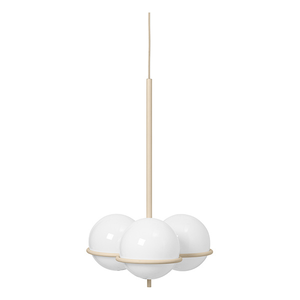 The Era Chandelier is an elegant statement lamp inspired by the clear lines and geometric shapes of the 20's Art Deco Movement. With three opal glass globes resting effortlessly on a light, powder-coated iron structure, the chandelier has a feminine and delicate expression, which nods to the distinctive era and represents everything we love about timeless design and simplicity in construction. Let the Era Chandelier adorn your hallway, stairways, or light up the conversation at the dinner table. Care instructions: Wipe with a damp cloth Material: Powder coated iron. White opal glass. E27 socket. 5 metre fabric cord in a matching colour Product note: Voltage: 220-240V - 50Hz. Light source: E27 max 13W LED. Bulb not included. Only approved for EU/NO/CH/UK. Separate version for US. Registered design Sustainability note: