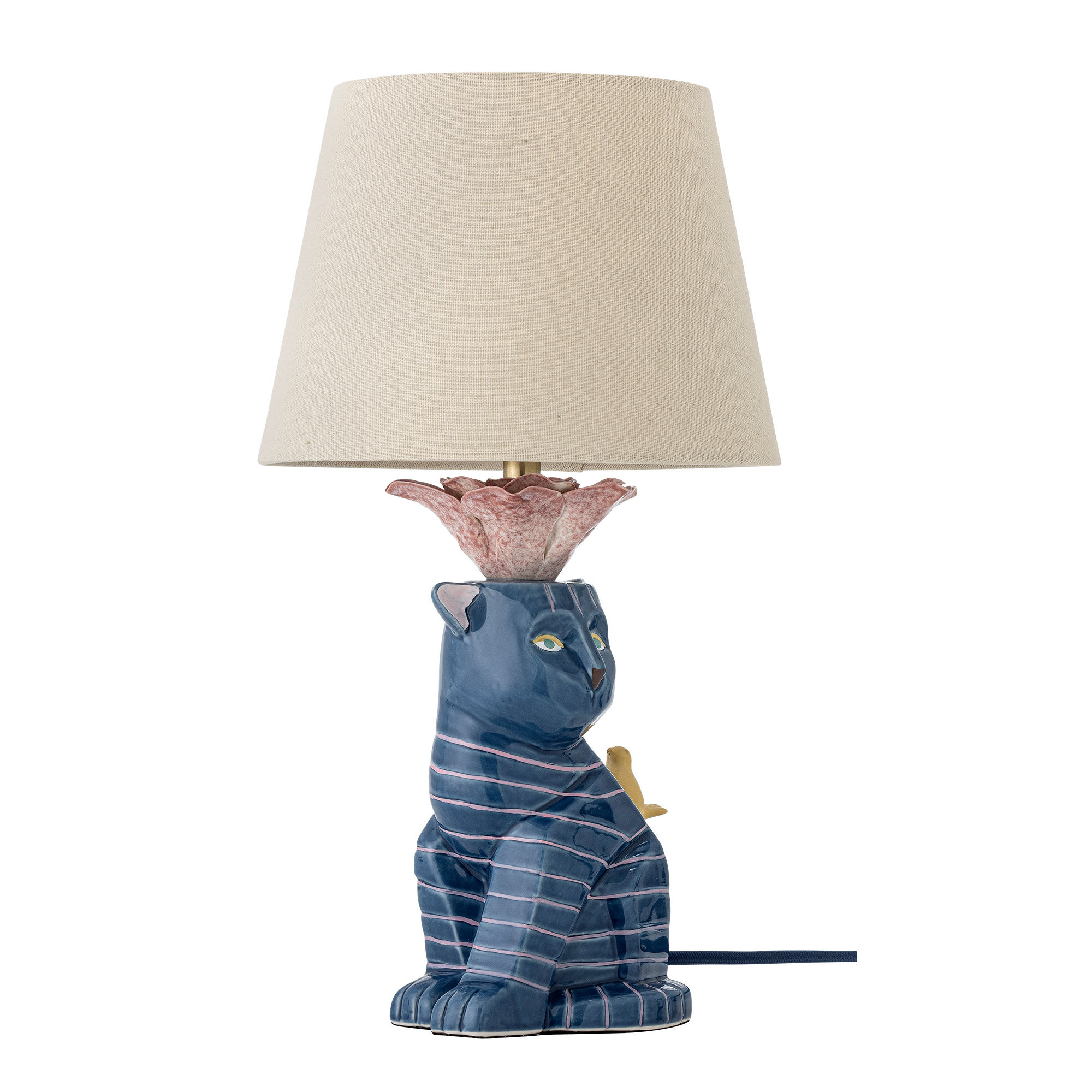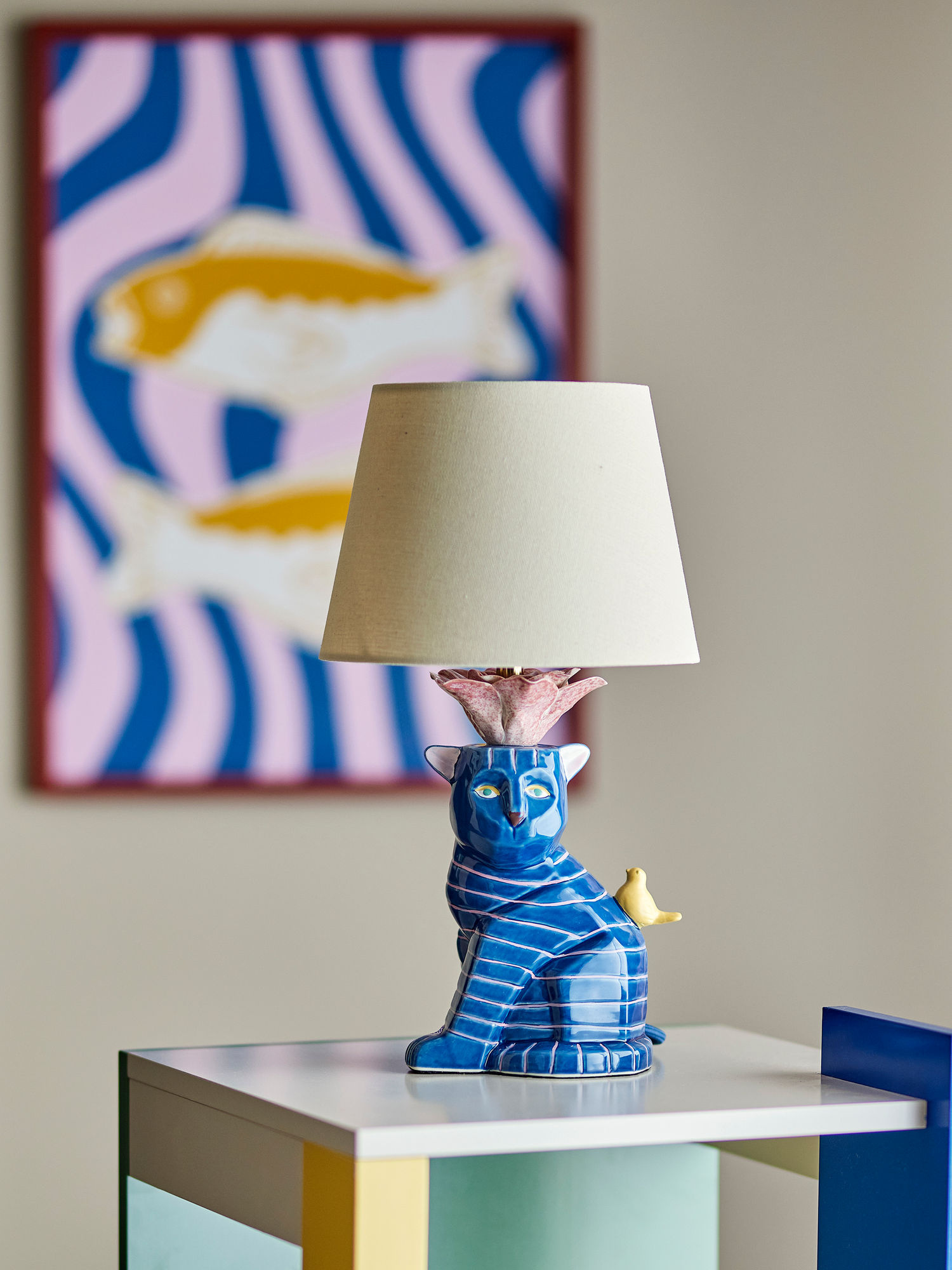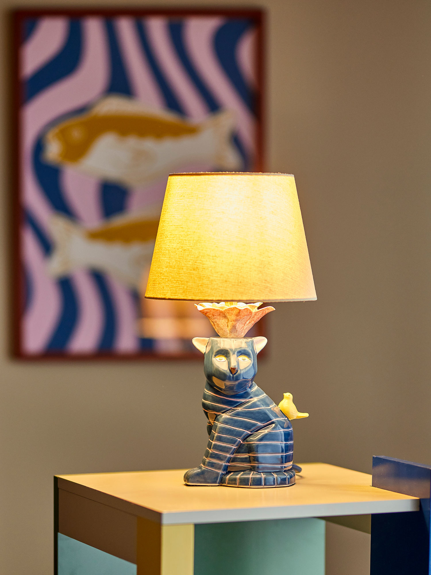 The Eri Table Lamp by Bloomingville features a stoneware base shaped like a cat, accented with fine pink stripes, expressive eyes, and a small yellow bird. A beige linen shade rests on a rose-like detail. Small variations in pattern and color intensity may occur, making each piece unique.
