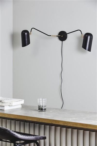 The ERIS wall lamp has 2 shades, that are adjustable. With golden details. 2 bulbs needed, not included. Black fabric cord. An elegant wall lamp for kitchen, living room or anywhere wanted.