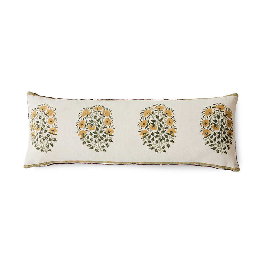 Create the ultimate retro bungalow feel in your home. Its slim, long shape makes this cushion ideal for deeper sofas, dining benches and outdoor sofas. With its meticulously embroidered front and retro floral back, it can be used in many ways, but it will certainly add warmth and nostalgia.Material:Cover: 100% cotton. Filler: polyester