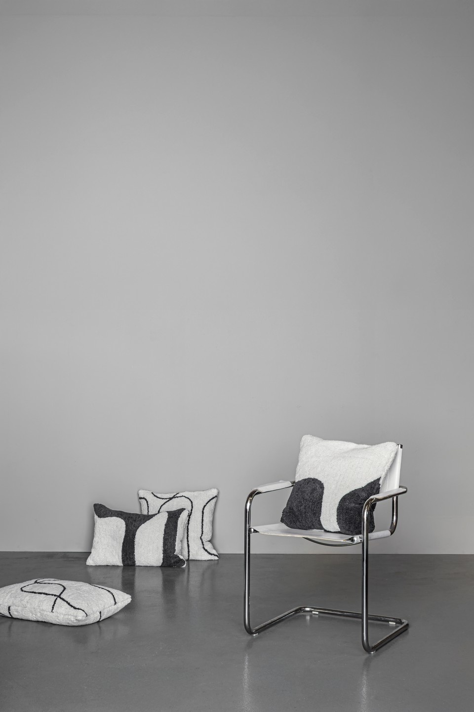 The FIGURA cushion cover from Mette Ditmer is made from a soft, tufted quality with an organic pattern in off-white and black. The graphic shapes and contrasts create a calm yet eye-catching expression, with soft forms and visual depth. Both the design and quality are consistent on both sides, giving the cushion cover a cohesive and refined appearance, no matter how it is placed. The tufted surface adds texture and tactility, making the cushion an inviting element in the interior. Please note: This product is a cushion cover only. - Material: 100% cotton, OEKO-TEX® 100-certified - Washing/Care Instructions: Wash at 30° C gentle wash inside out. Use detergent without bleach. Tumble dry on low temperature.
