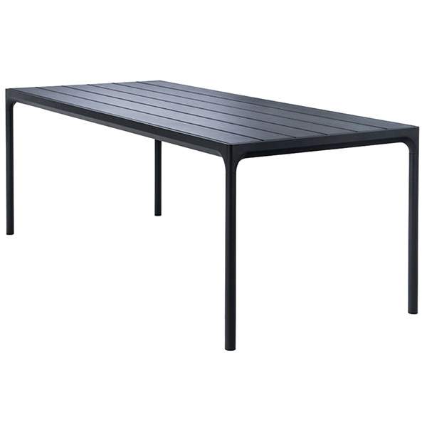 A dining table with a top and four legs – that is what you get in FOUR, no matter which size you choose. The special developed extruded profile in the table frame make FOUR a remarkable strong table. Comes in 4 different sizes with table top and legs in powder coated black aluminum. DIMENSIONS: H:74 x W:90 x D:90 cm MATERIALS: Frame: Powder coated black aluminum Table top: Black metal lamellas DESIGNED BY: Henrik Pedersen