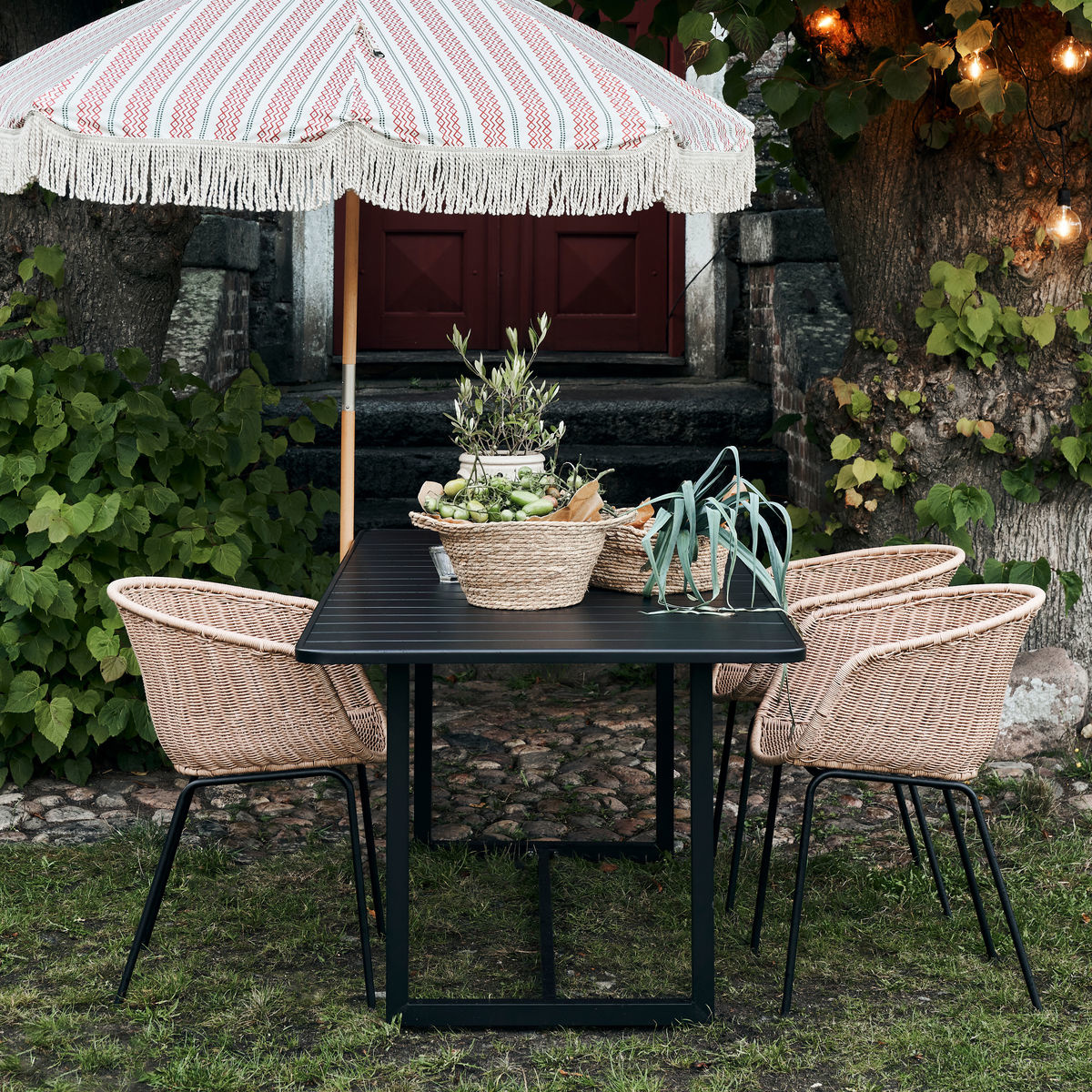 The large Helo table from House Doctor gives your outdoor space an informal touch. A matt, black powder coating completes the iron table to make it timeless and suitable for any interior style. Ample leg room is ensured by the stretcher base which also provides increased stability to the overall design. With its easy-to-maintain surface, you get a table fit for everyday life lived outdoors. Mix with your favourite chairs for a personal look and enjoy your outdoor dinners in style. In order to prolong its lifespan, do not leave the Helo table outside in the rain or cold, but move it inside for safe storage. Material: Iron Care instructions: Clean with a moist cloth, Assembly required