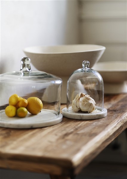 This glass cloche with marble is crafted in Firozabad, India, combining clear glass and white marble for elegant food storage. Partially recycled materials highlight sustainability, while its design enhances kitchen or café displays with refined harmony.