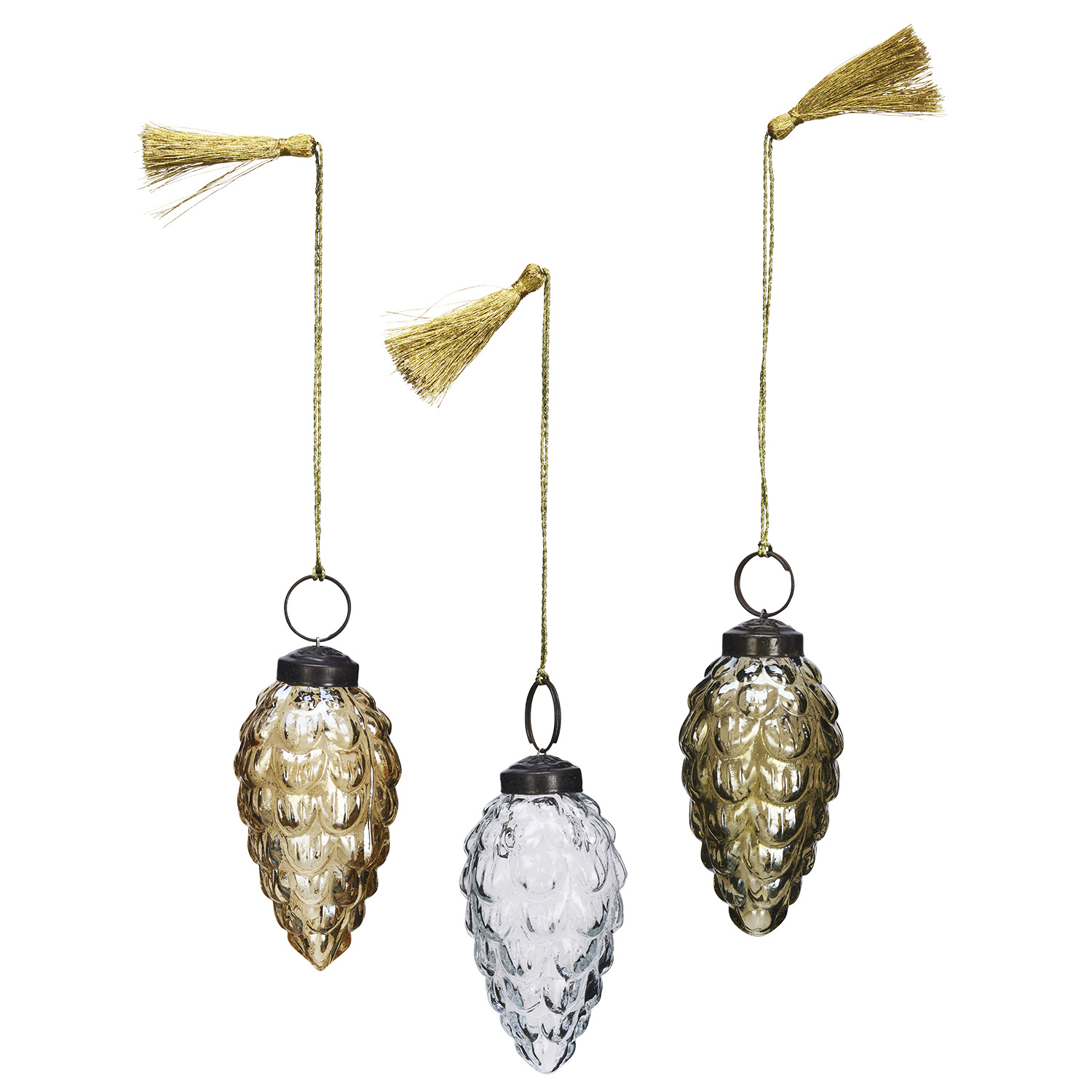 This set of three hanging glass pinecones - set 3 - , crafted in Firozabad, India, comes in amber, smoke, and clear. Designed to mimic natural pinecones - set 3 - , each piece features a gold string with a tassel. Made from partially recycled glass.