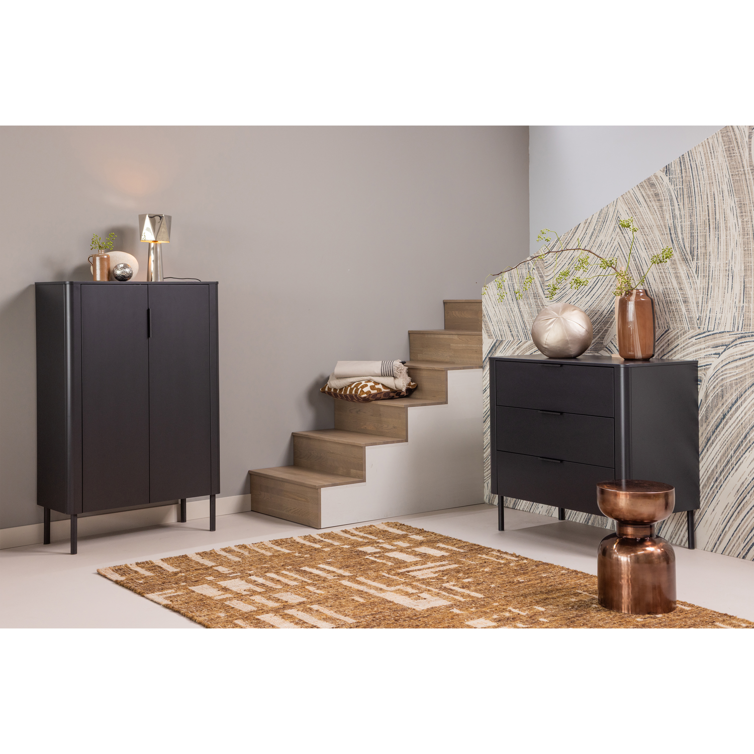 - Moderne ladekast met tijdloos design - Gevormd uit FSC Mix-gecertificeerd grenenhout - Afgewerkt in een matzwarte kleur - H 93 cm x B 94 cm x D 52 cm De Gunnar ladekast van het Nederlandse interieurmerk WOOOD biedt een stijlvolle oplossing voor extra opbergruimte. De drie ruime lades met soft-close sluiting en subtiele greepjes maken het eenvoudig om kleding of accessoires gemakkelijk op te bergen. Dankzij de afgeronde hoeken, moderne afwerking en matte lak is de ladekast niet alleen functioneel, maar ook een toevoeging aan ieder interieur. De Gunnar ladekast is vervaardigd uit massief grenenhout en heeft een tijdloze uitstraling. Materiaal De grenenhouten meubelen uit onze collecties zijn FSC Mix-gecertificeerd en worden op diverse manieren behandeld. Zo wordt het grenen materiaal geschuurd en voorzien van een fraaie, dekkende laklaag. Grenenhout wordt gekenmerkt door zichtbare vlam- en nerftekeningen. Afmetingen - Hoogte: 93 cm - Breedte: 94 cm - Diepte: 52 cm - Poothoogte: 20 cm - Plank dikte: 1,5 cm - Draaggewicht per lade: 15 kg (verdeelde belasting) - Gewicht: 30,5 kg Onderhoud De grenenhouten items uit onze collecties worden behandeld met een milieuvriendelijke, watergedragen lak wat de levensduur van het product aanzienlijk verlengt. Behandeld grenenhout is eenvoudig schoon te houden met een lichtvochtige doek. Om kringen en plekken in het hout te vermijden is het aangeraden om vochtige vlekken direct te drogen. Stabiel en veilig gebruik Voor kasten hoger dan 50 cm raden we aan om extra aandacht te besteden aan de muurbevestiging. De montage van de valpreventie voorkomt ongelukken en behoudt de kast voor kantelen. Levering Dit meubel wordt geleverd in twee pakketten en is eenvoudig te monteren aan de hand van de bijgeleverde montage-instructie. Plaats voor het beschermen van harde vloeren viltglijders aan de onderzijde van de poten. Monteer met extra zorg de valbeveiliging om ongelukken te voorkomen.