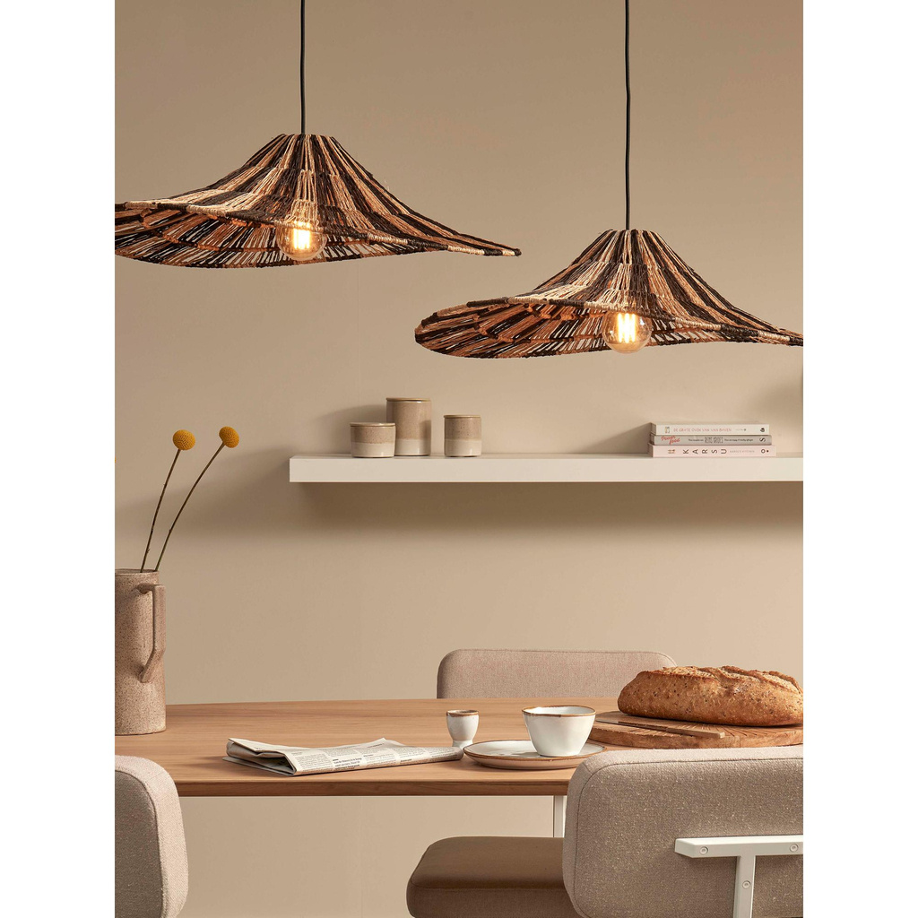 Ben je op zoek naar een hanglamp die jouw eettafel laat stralen? De Cuzco hanglamp zwart & naturel van GOOD&MOJO is precies wat je nodig hebt! Met een diameter van 65 cm, hoogte van 20 cm en verstelbaar snoer van 200 cm, zorgt deze handgemaakte lamp voor eenheid en sereniteit in je interieur. Het stijlvolle strepenpatroon in zwart en naturel zorgt voor een mooie lichtverspreiding en een gezellige sfeer. De speelse wave vorm geeft de lamp een chique uitstraling, perfect voor Bohemian, Japandi, en Scandinavian stijlen. Het zwarte snoer en fitting voegen een moderne touch toe. De Cuzco hanglamp is ideaal boven de eettafel of in de slaapkamer. Handgemaakt in Vietnam, is elke jute lamp uniek, duurzaam, en milieuvriendelijk. GOOD&MOJO staat bekend om hun toewijding aan duurzaamheid. Kies je voor de Cuzco lamp, dan steun je een merk dat zich inzet voor een betere wereld. Houd er rekening mee dat een product van natuurlijke materialen altijd uniek is en dat het uiterlijk dus kan variëren.