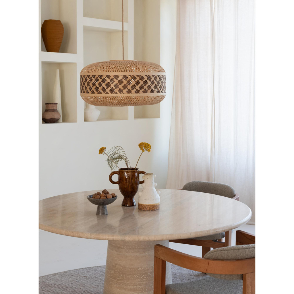 Hanglamp Langkawi naturel is geïnspireerd op de tropische pracht van de Langkawi archipel, waar natuur en traditie samenkomen in harmonie. Dit unieke ontwerp van de plafondlamp bestaat uit drie prachtig met de hand gevlochten delen, waarvan het centrale element een opvallend grafisch patroon van bamboe toont. Wanneer de lamp brandt, ontstaat een fascinerend schouwspel van licht en schaduw dat de ruimte op sfeervolle wijze verrijkt. De Langkawi lamp straalt de rust en charme van het eiland uit. De naturel kleur van de hanglamp past in uiteenlopende interieurstijlen. Dankzij de natuurlijke materialen en elegante uitstraling is het een subtiele eyecatcher in de woonkamer, eetkamer of slaapkamer.