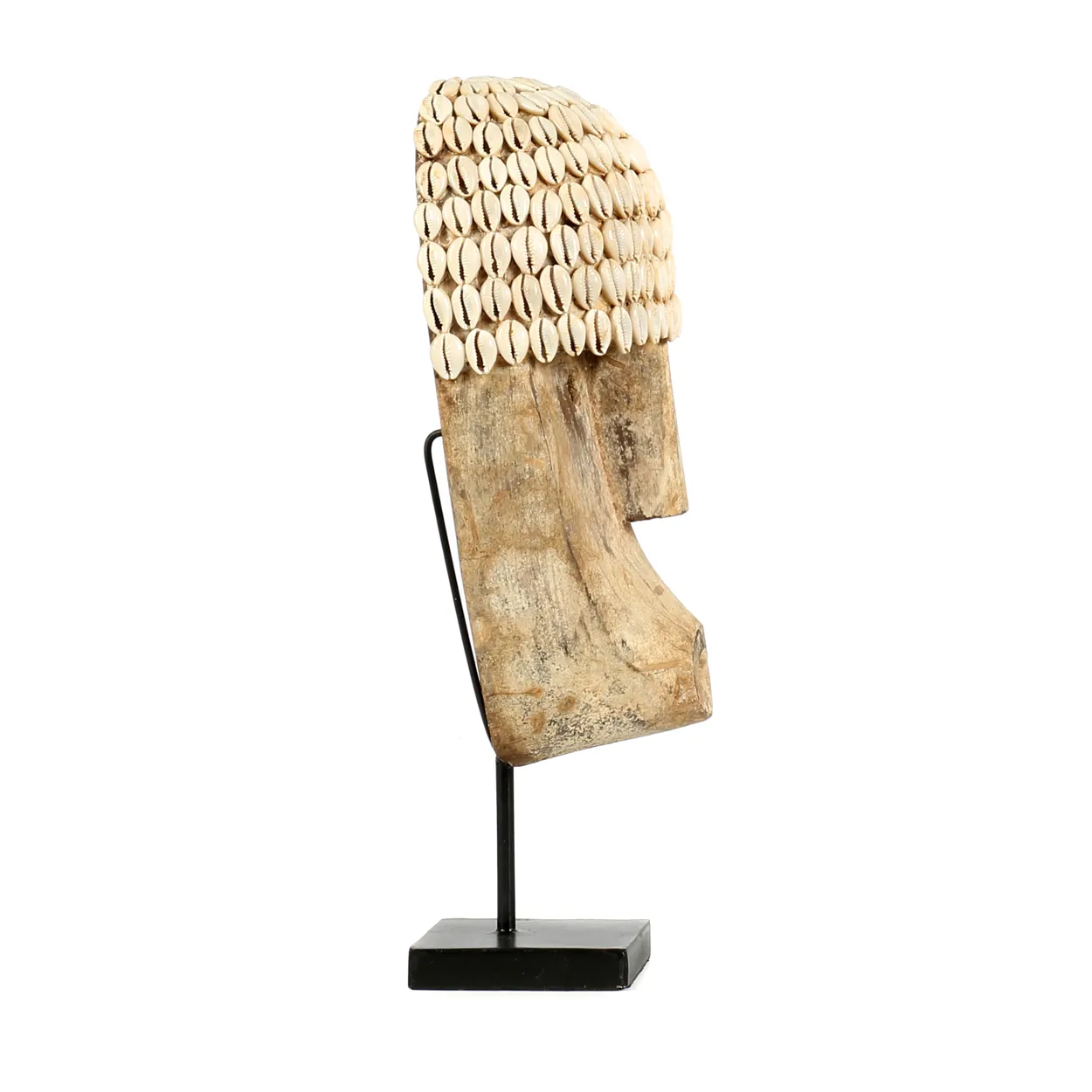 This unique 'main' display on stand is a stunning ethnic beauty. The head is decorated with beautifully hand-placed shells. This piece definitely deserves a special place to beautify your interior, covered patio or garden.