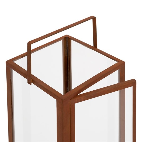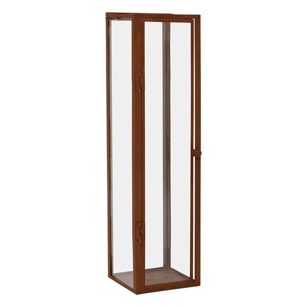 Cast some light on an early evening, when the moon hides behind a gloomy set of clouds, and enjoy the quiet surroundings of home. Our Hurricane Celso, available in two different sizes, loves to accompany you and shine some light upon your urban home. Modern design that comes in iron, with a timeless corten steel finish, magnetic lock on the glass door and just the right play of lines to stand out in any urban interior. Rust finish on metal: color can change with exposure to air and use of hurricane. Material: Iron/ Glass Characteristics of the product: - Magentic closure - Tape inside, looking for alternative. common to use the tape. - Kleine stukjes of over de gehele lengte?"