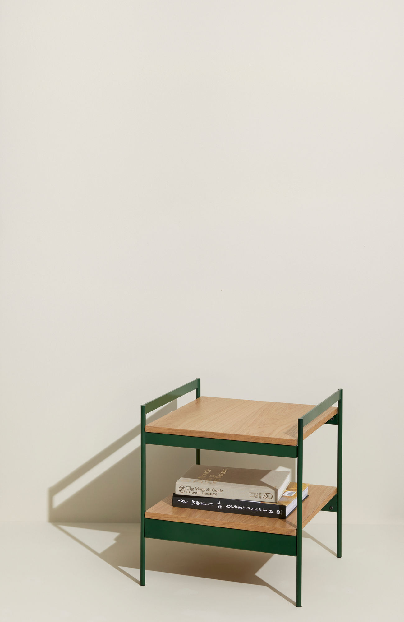 Sidetable made from FSC®-certified wood and green-coloured metal with a shelf.