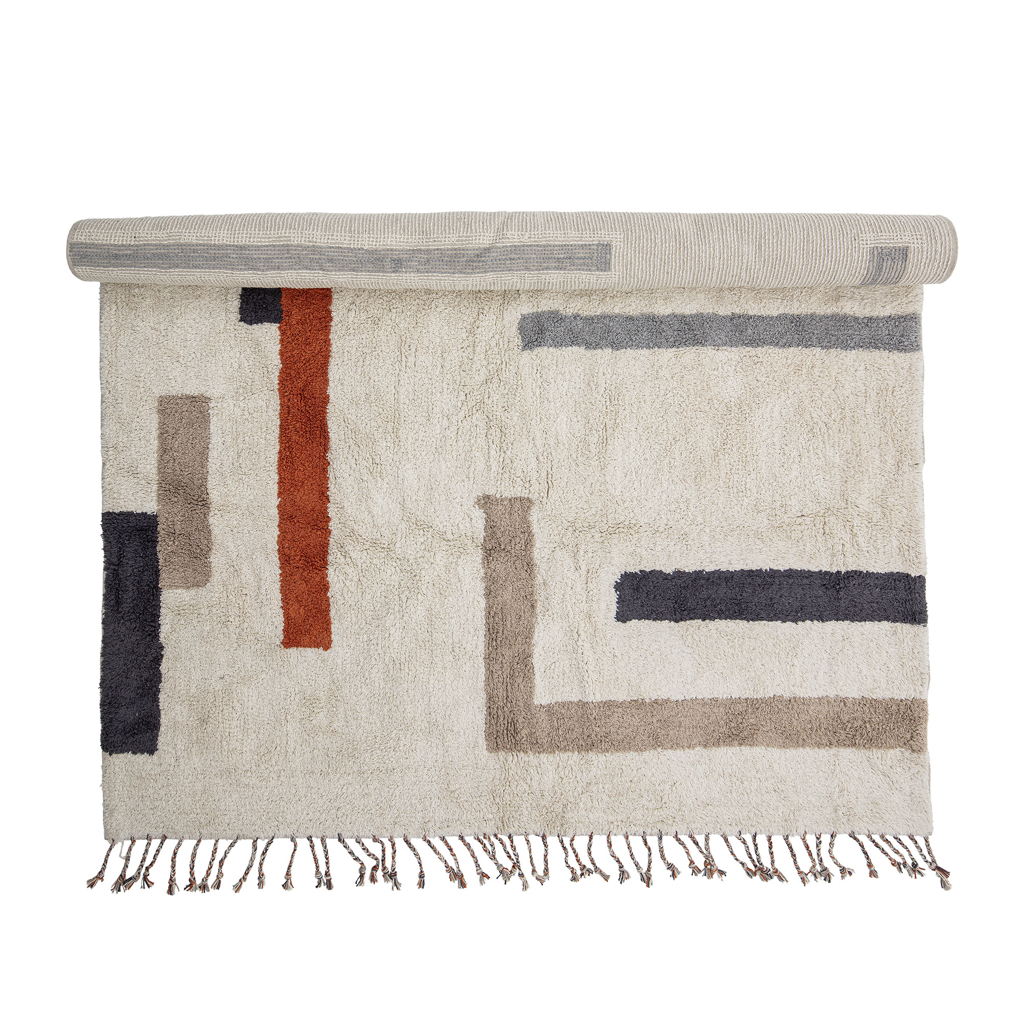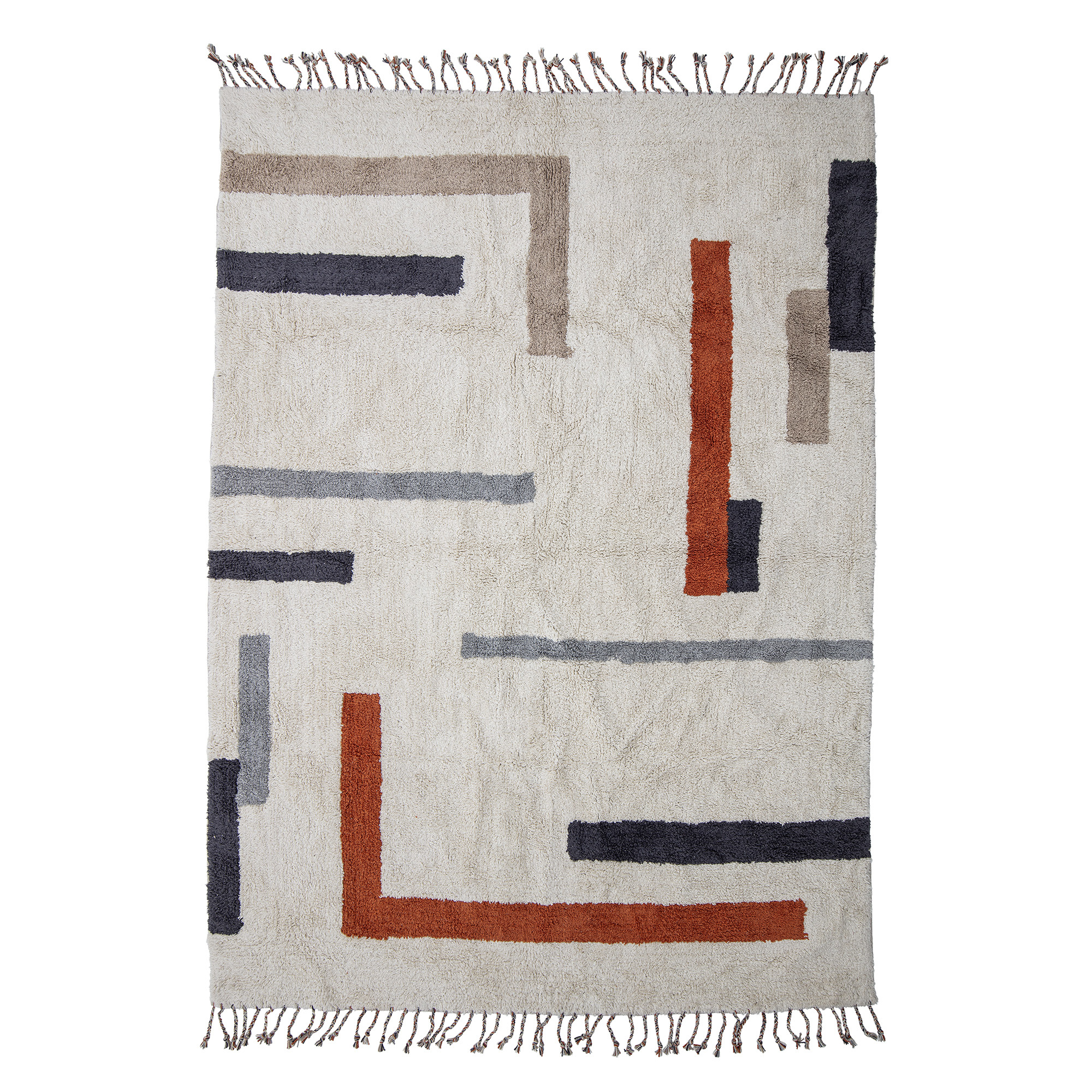 A tufted rug with small pops of colour that contrasts the natural coloured cotton that the rug is woven in. Tufted rugs are perfect for keeping your feet warm because of their natural isolation ability. Place it under your table or in front of a chair to make a warm spot on the floor. The fringes on the edges contribute to the cosy feeling that this rug brings to your home. Material: 97% Cotton, 3% Other Fibers