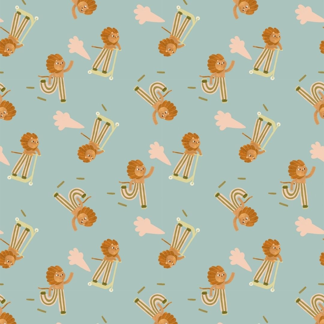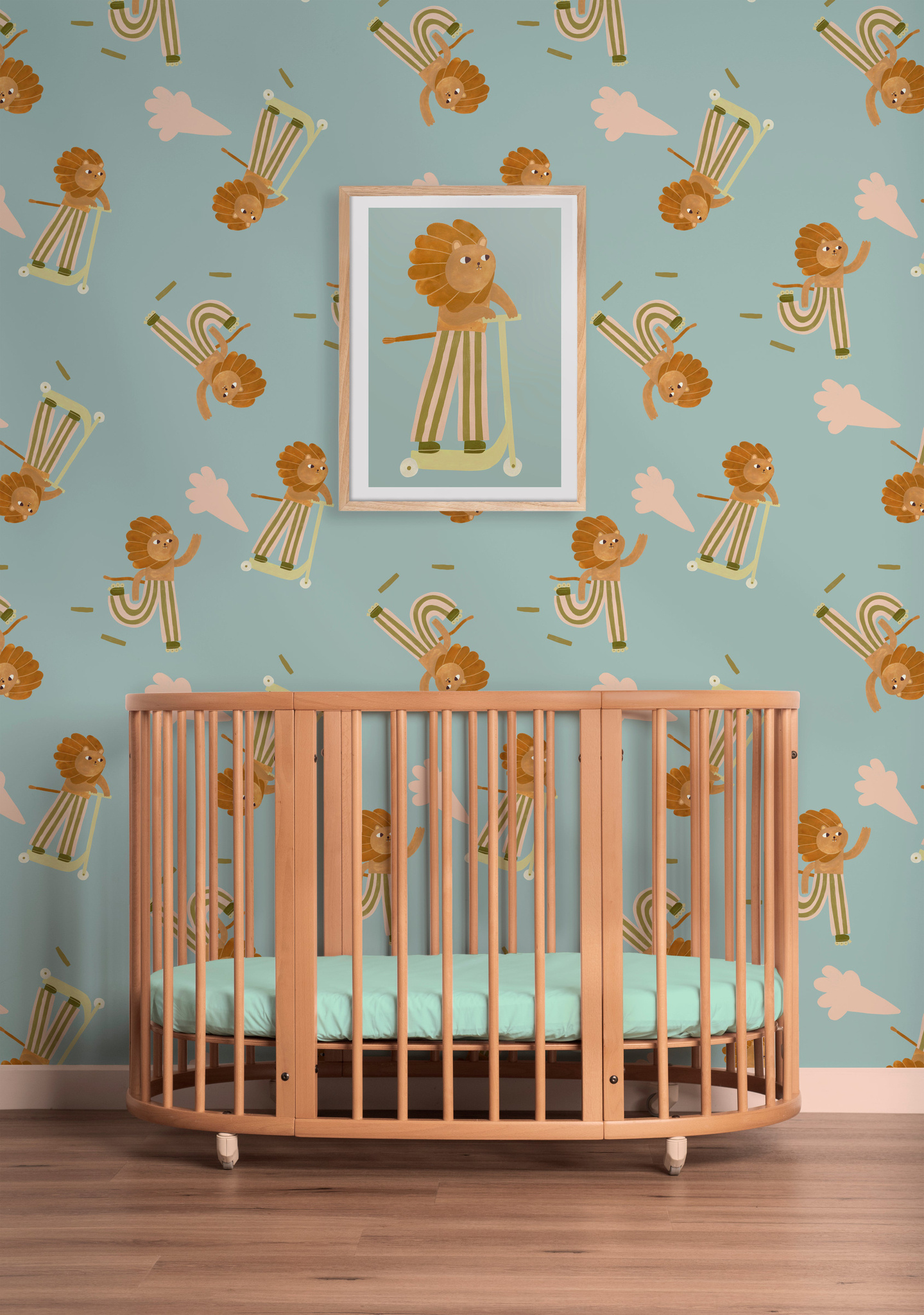 De helderblauwe achtergrond geeft dit behang een frisse en luchtige uitstraling. De mintgroene step en het groen gestreepte broekje van de leeuw zorgen voor speelse details die het design uniek maken. Het resultaat is een vrolijk dierenbehang dat kinderen uitnodigt tot dromen en spelen.