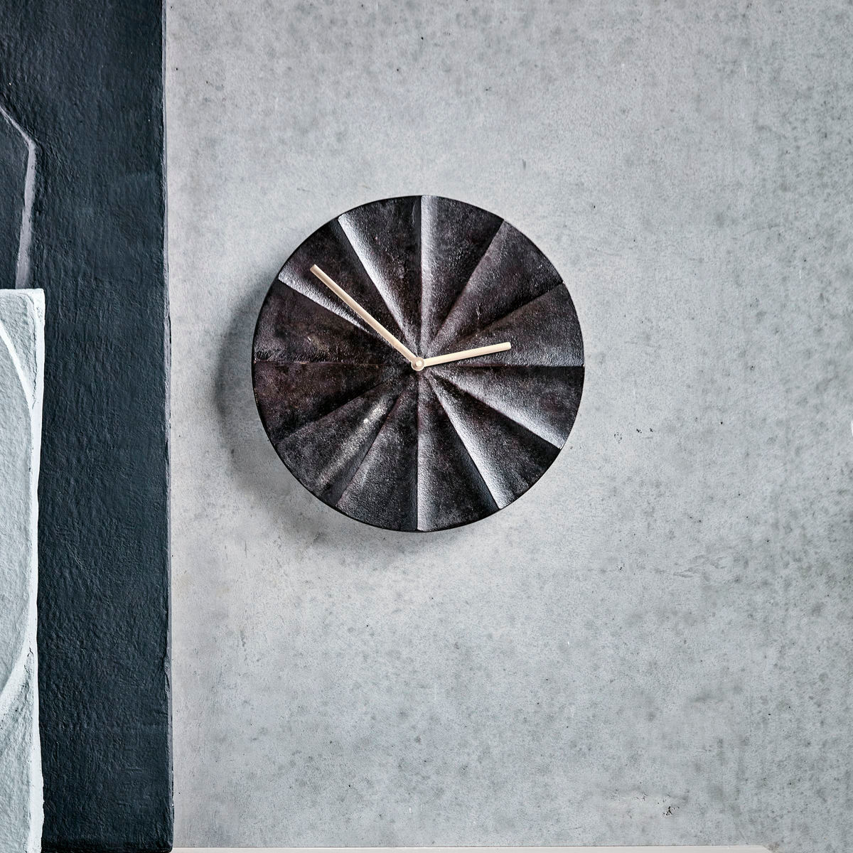 Met deze handgemaakte wandklok voeg je een artistieke elegantie toe aan je interieur. De klok is vervaardigd uit gegoten aluminium met een gebronsde messing afwerking, waardoor hij subtiel en stijlvol in verschillende interieurstijlen past.